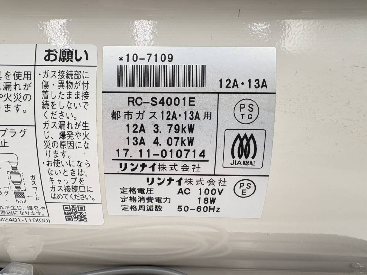 【動作確認済】Rinnai リンナイ ガスファンヒーター RC-S4001E 140-9453 都市ガス 12A・13A用 2017年製 暖房器具