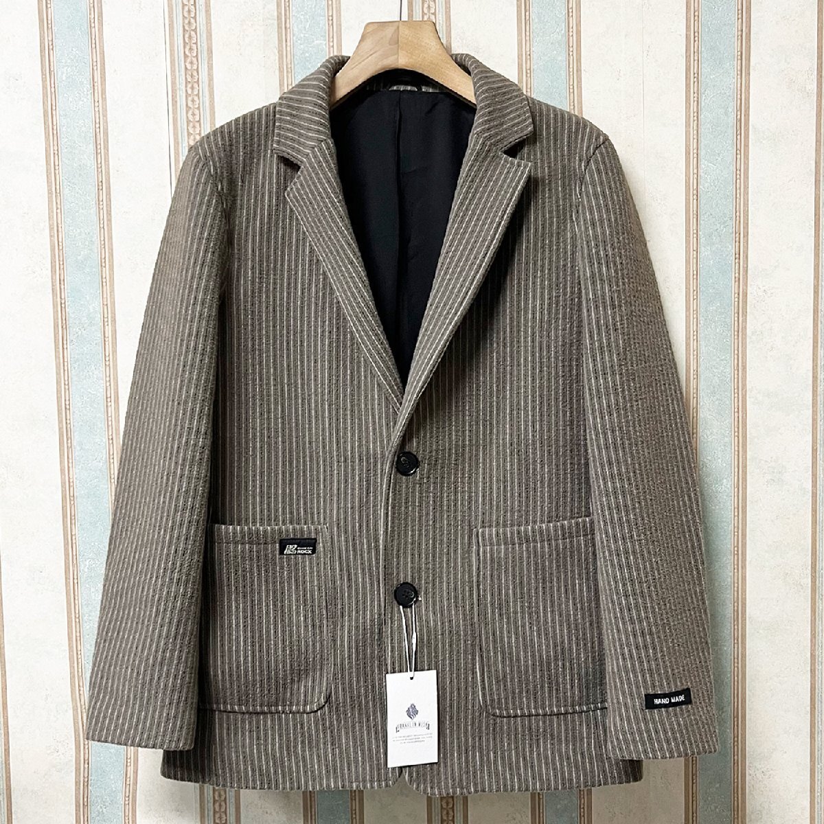 上品なストライプ柄で、縦のラインが強調され、着せ効果も期待できます。フロントには2つボタンを配置し、すっきりとした印象に仕上げました。両サイドにポケットがあり、携帯電話や鍵などの小物を収納するのに便利です。内側には隠しポケットがあり、小さな貴重品を盗難に遭うことなく安全に収納できます。