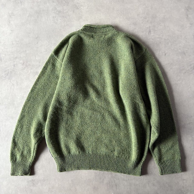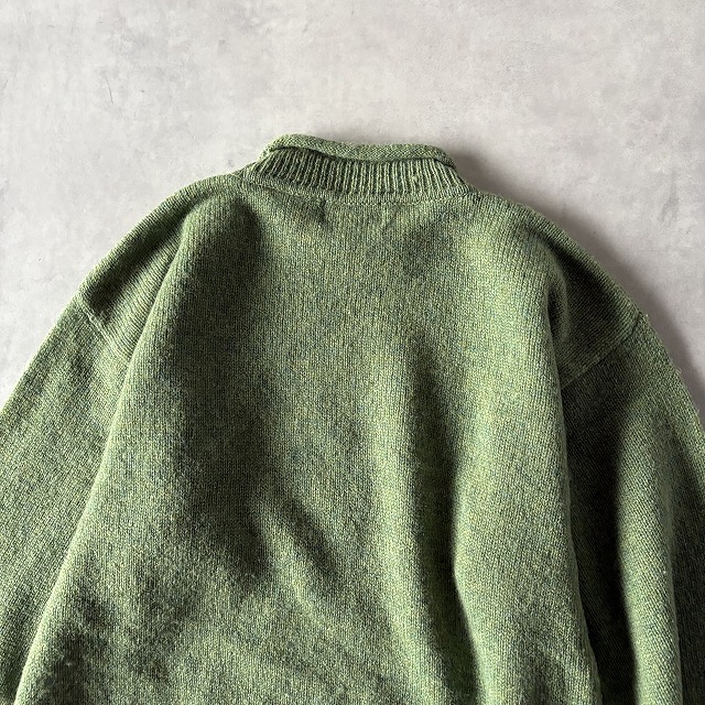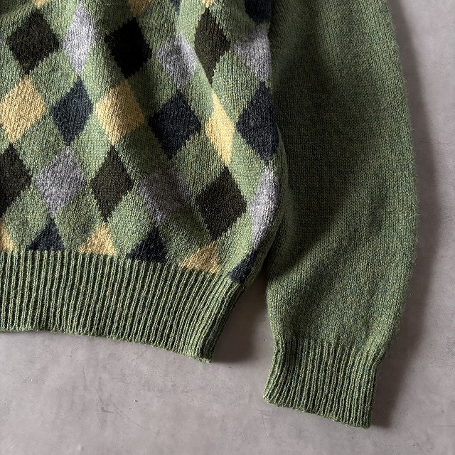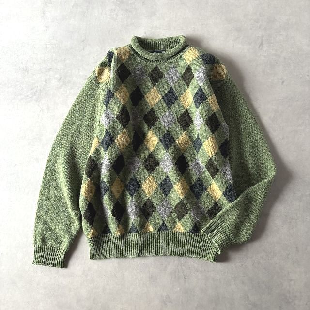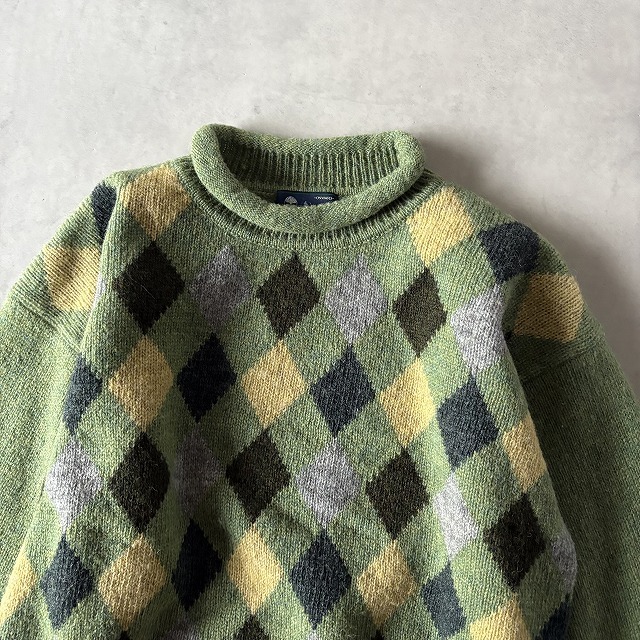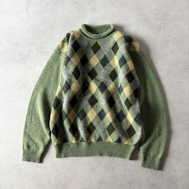 美品 五大陸 オンワード樫山 ウール100% ダイヤチェック柄 ロールネック プルオーバー ニット セーター アーガイル 丸首 ミドルゲージ メンズ(L) グリーン系 毛 /r-925