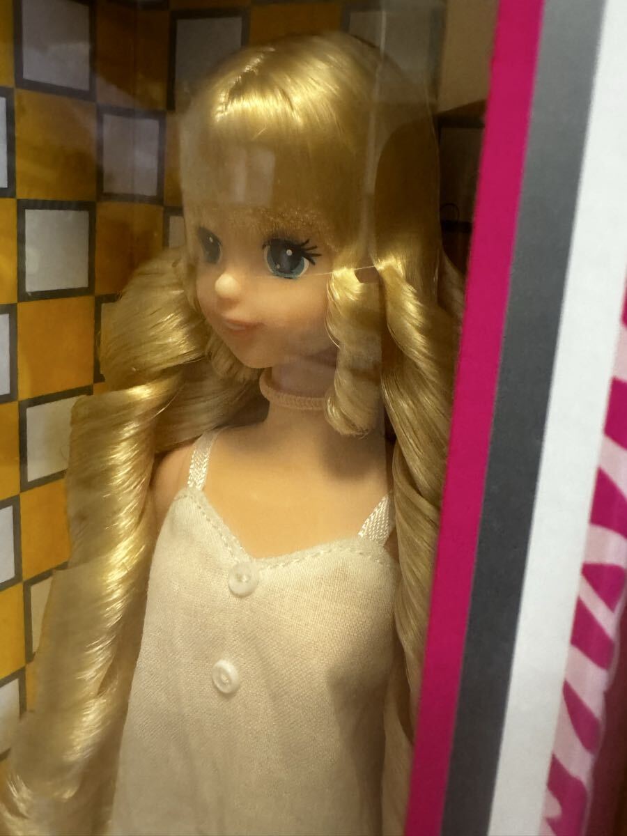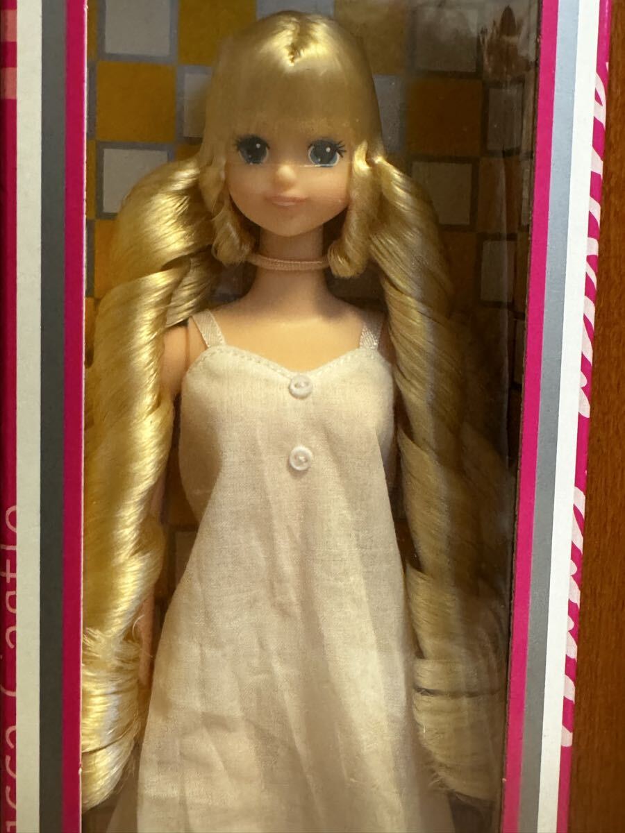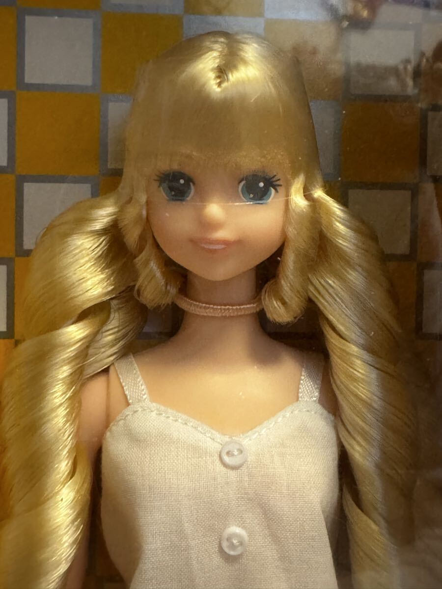 リカちゃんキャッスル製ジェニーフレンドのジェーンです。ジェニーフレンドの中でもオープンマウスのレアなフレンドです。普段は日焼けした活発なイメージのジェーンですが、ノーマル肌にふんわり柔らかなメイク、ロング縦ロールヘアの珍しい仕様となっています。なかなか発売されないレアなフレンドドールでもあります。暗所にて大切に保管していましたので、箱ダメージ、焼け等ありません。