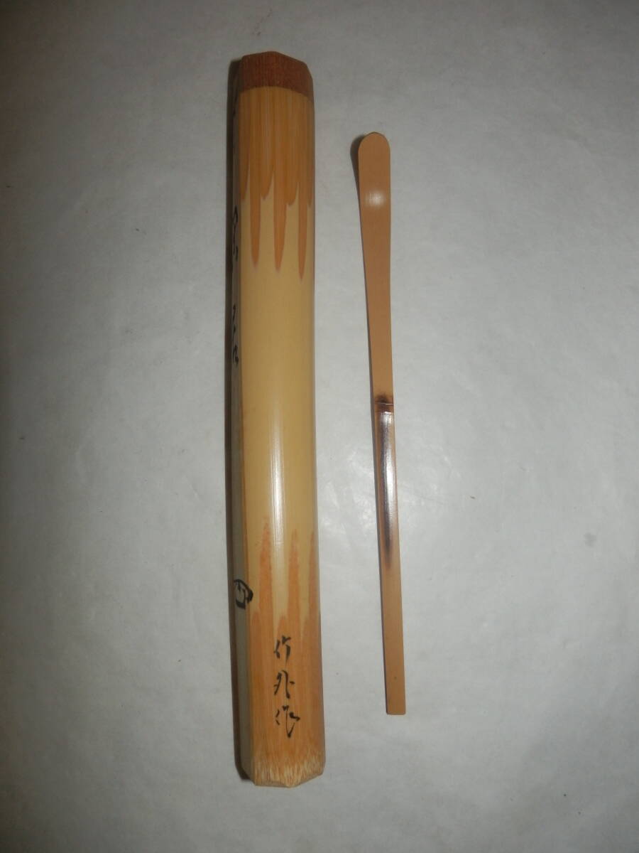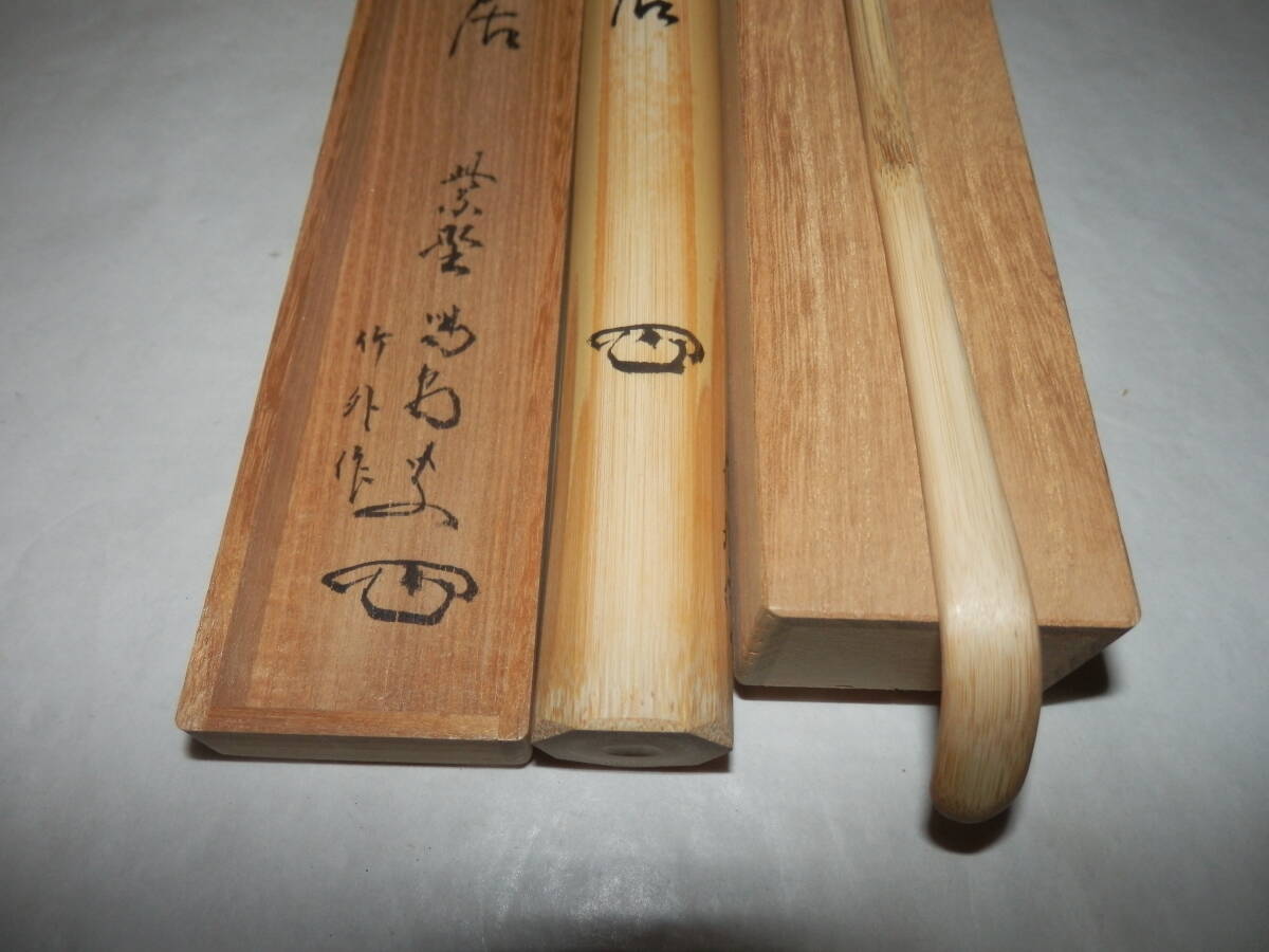 「中古品・茶道具」大徳寺の龍源院の細合喝堂さんの茶杓です。銘「閑居」です。 竹器師の竹外さんの作です。茶杓長さ約18.2cm 竹筒・桐共箱「ヤケ、シミ等有」。 どうぞ宜しく。