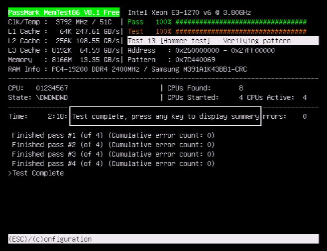 念のため Memtest86(デフォルト設定)を実行し、ノーエラーで完走しました。