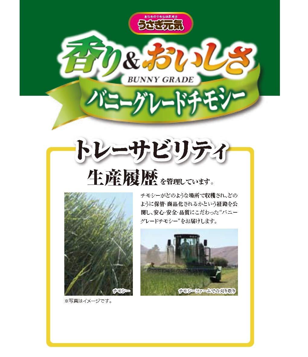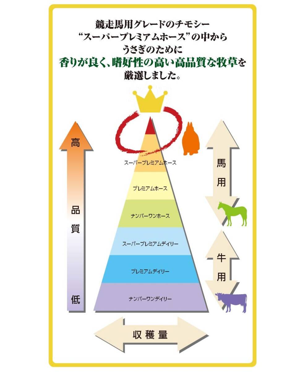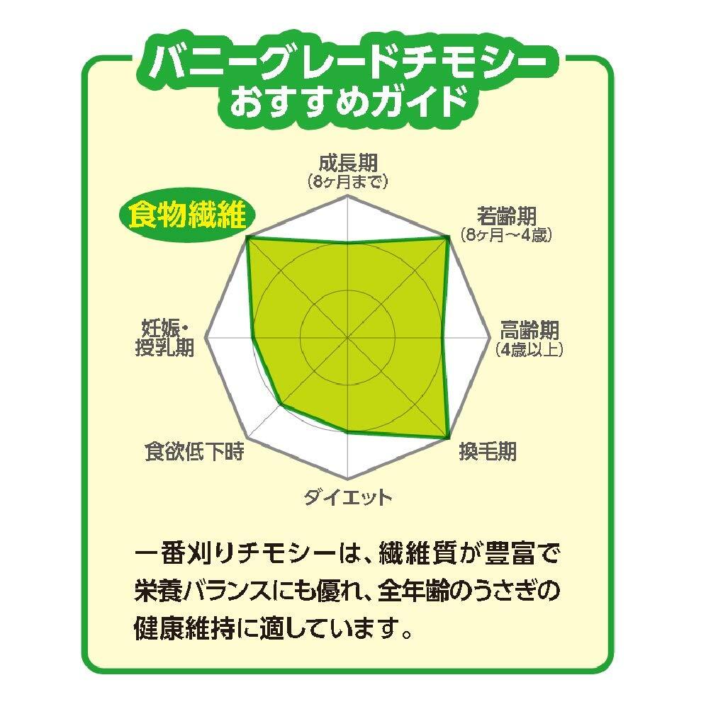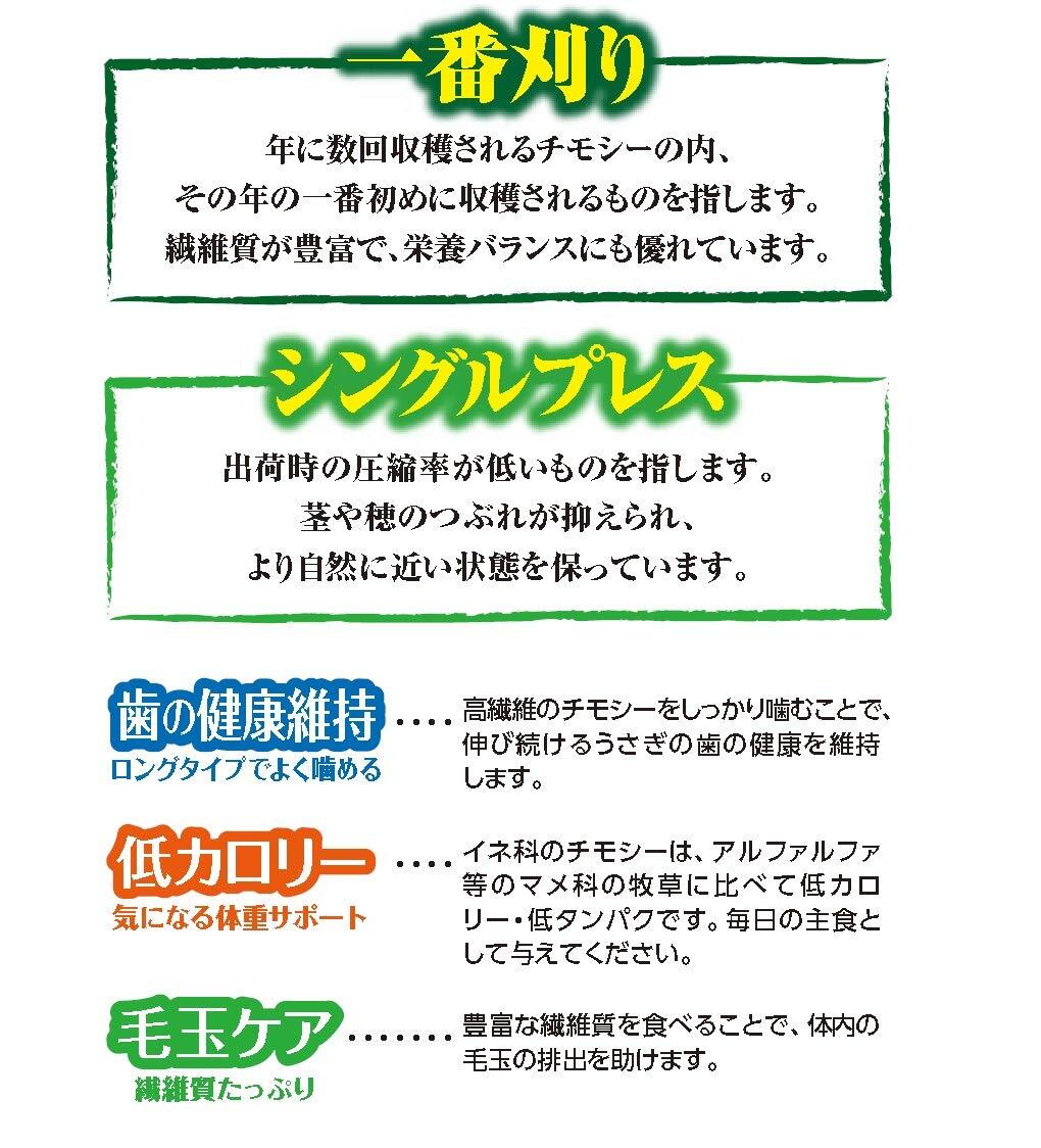 商品紹介一番刈りシングルプレスの厳選スーパープレミアムチモシー。競走馬用グレードのチモシー「スーパープレミアムホース」の中から、うさぎのために香りが良く、嗜好性の高い高品質な牧草を厳選しました。ロングタイプでよく噛めます。低カロリーなので気になる体重サポート。繊維質たっぷりで毛玉ケア。使用上の注意●お買い上げ後は直射日光・高温多湿な場所を避けて常温(25℃以下)で保存してください。●開封後は必ず袋の口を閉じて、直射日光の当たる場所や高温多湿な場所を避け、冷暗所で保存してください。また開封後はなるべく早くお与えください。※本品は自然の牧草を原料としていますので、開封後の保管状態により虫が発生することがあります。※長期保存しますと、変色する恐れがありますが品質には問題ありません。※自然の牧草を使用しているため、季節によって商品の色合いや香りに多少のバラツキがあります。原材料・成分チモシー使用方法●他のフードと合せて与え、いつでも食べられるようにしてください。●食べ残したり、汚れた牧草は毎日取り替えてください。※新鮮な水をいつも用意してあげましょう。●フード(牧草)が変わると警戒し本品を与えてもすぐには食べないことがあります。このようなときは、今与えているフード(牧草)に混ぜると徐々になれてよく食べるようになります。
