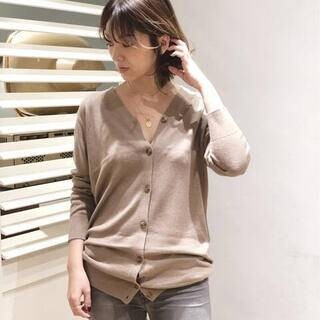 顔色になじむ柔らかなベージュも大人の女性にピッタリです。端境期に活躍するカーディガンは、クローゼットに一枚揃えておきたいアイテムです。