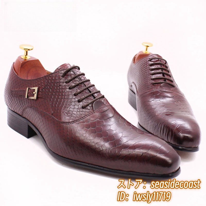 最高級★定価9万 ビジネスシューズ 本革 レザーシューズ 新品 紳士靴 超希少 蛇紋 職人手作り フォーマル 高級牛革 革靴 レッド 24.5cm