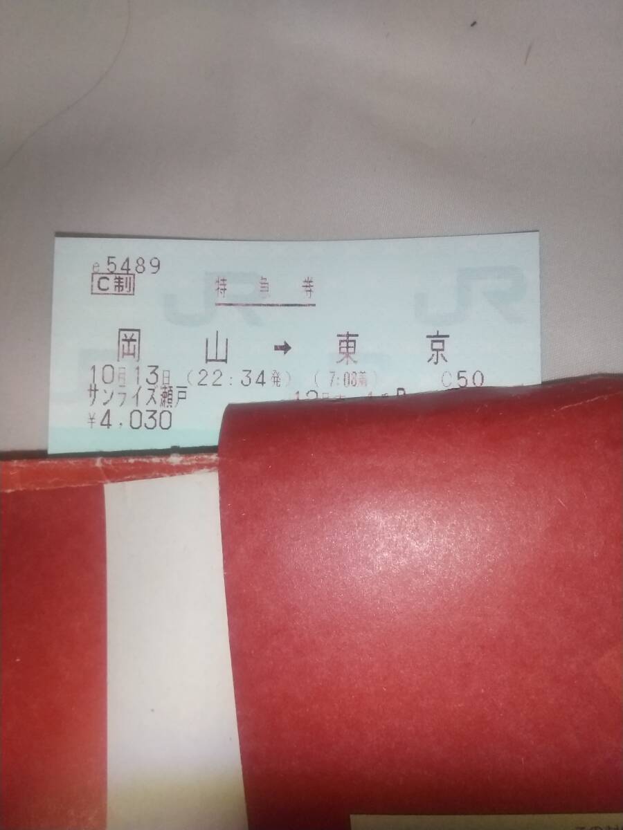 10月13日発のサンライズ瀬戸の岡山駅→東京駅のノビノビ座席1枚です。
