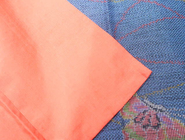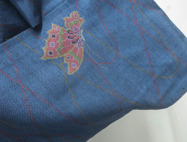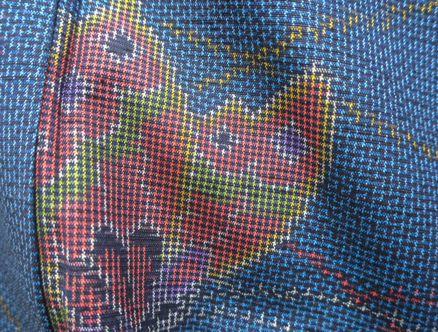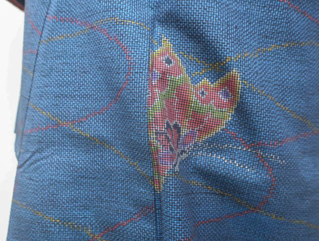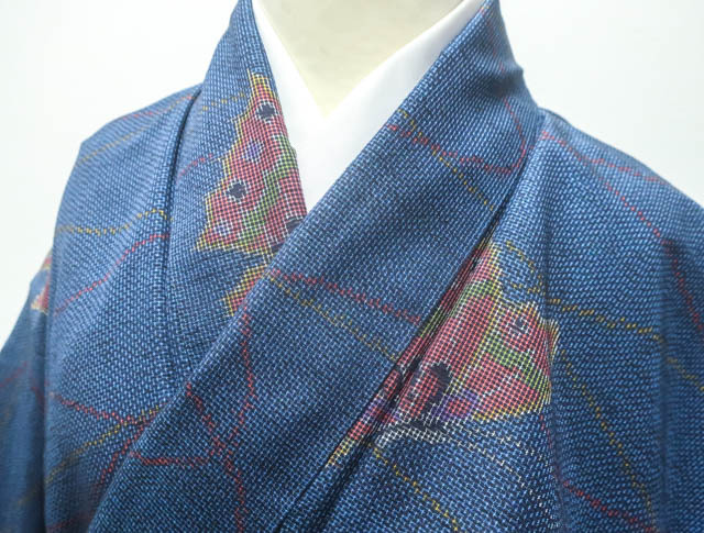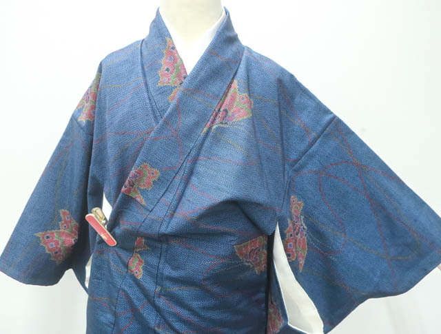 リサイクル商品のため、胴裏に点シミがございますがご着用いただけると存じます。 地色は、紺色です。 1枚目の画像が近いお色かと思われます。 素材は正絹です。 |