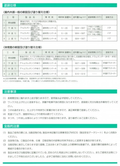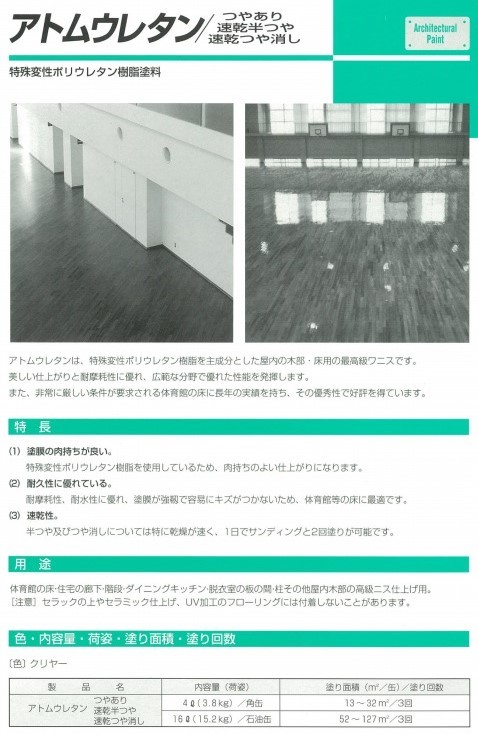 耐摩耗性、耐水性に優れ、塗膜が強靭で容易にキズがつかないため、体育館等の床に最適です。