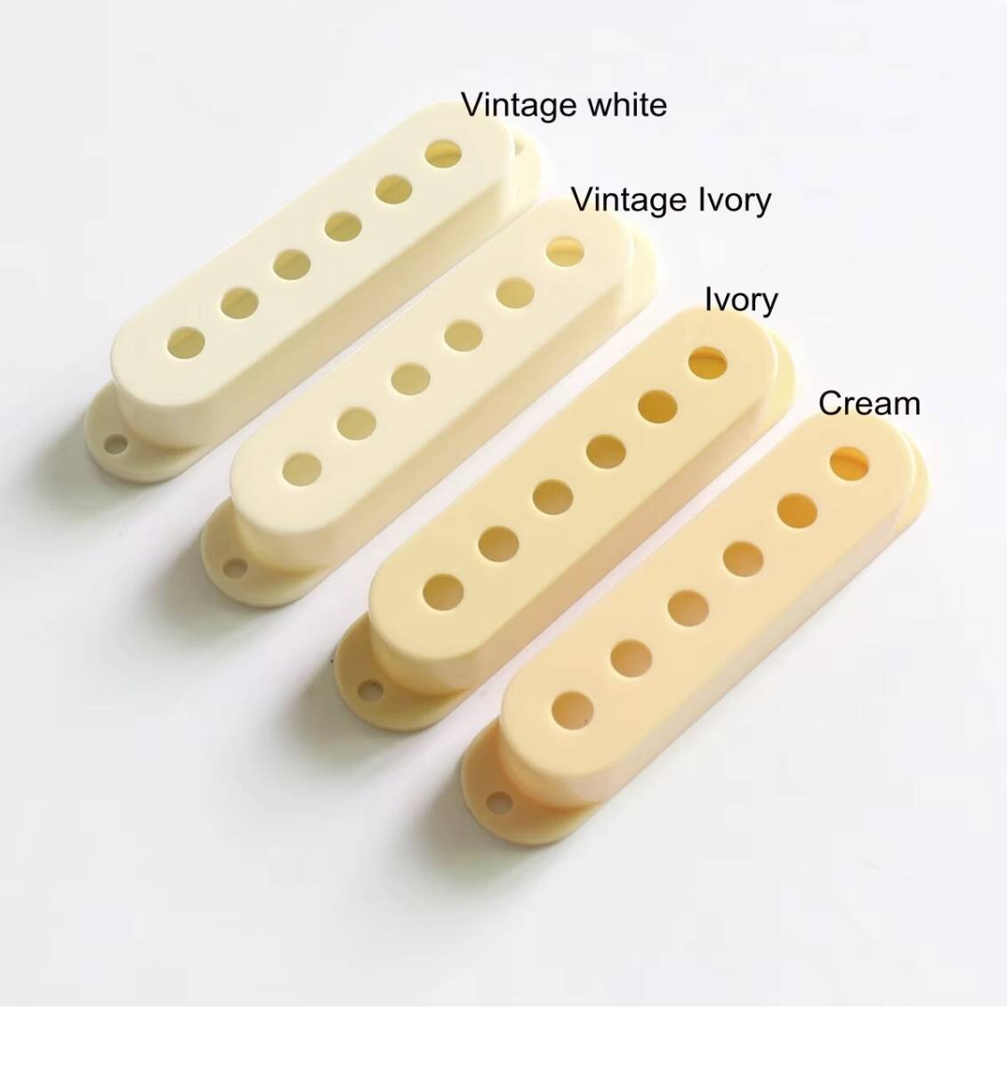 カラーは、メーカー発表ではIvory=アイボリー(最後の色見本写真を参考にしてください)となっておりますが、微妙な色合いで、ピックガードの色によって色のニュアンスが変わって見えます。写真は同じホワイトバランス/同じ照明ですが、ピックガードの色によって微妙に色が異なって見える感じもします。