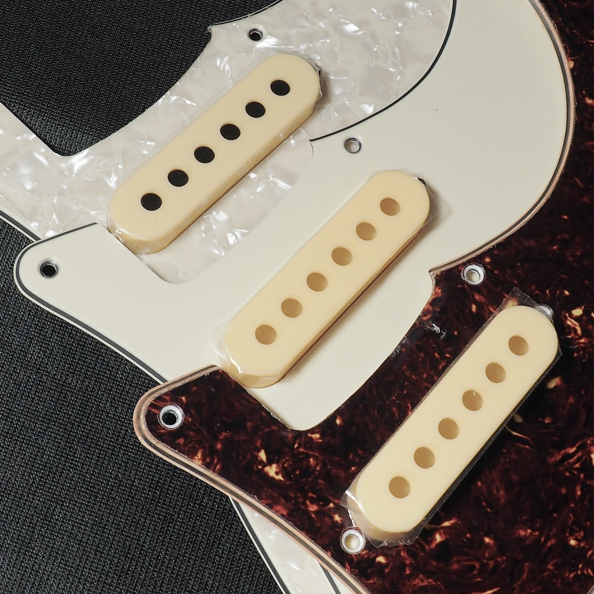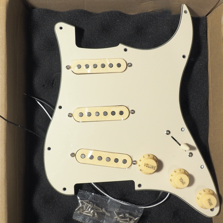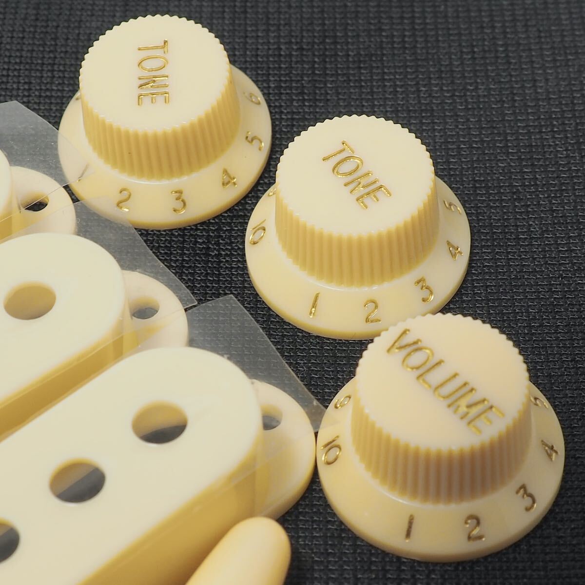 ストラトキャスターのピックアップカバー3個、ハットノブ3個、切り替えスイッチノブ、アームバーノブのセットです。