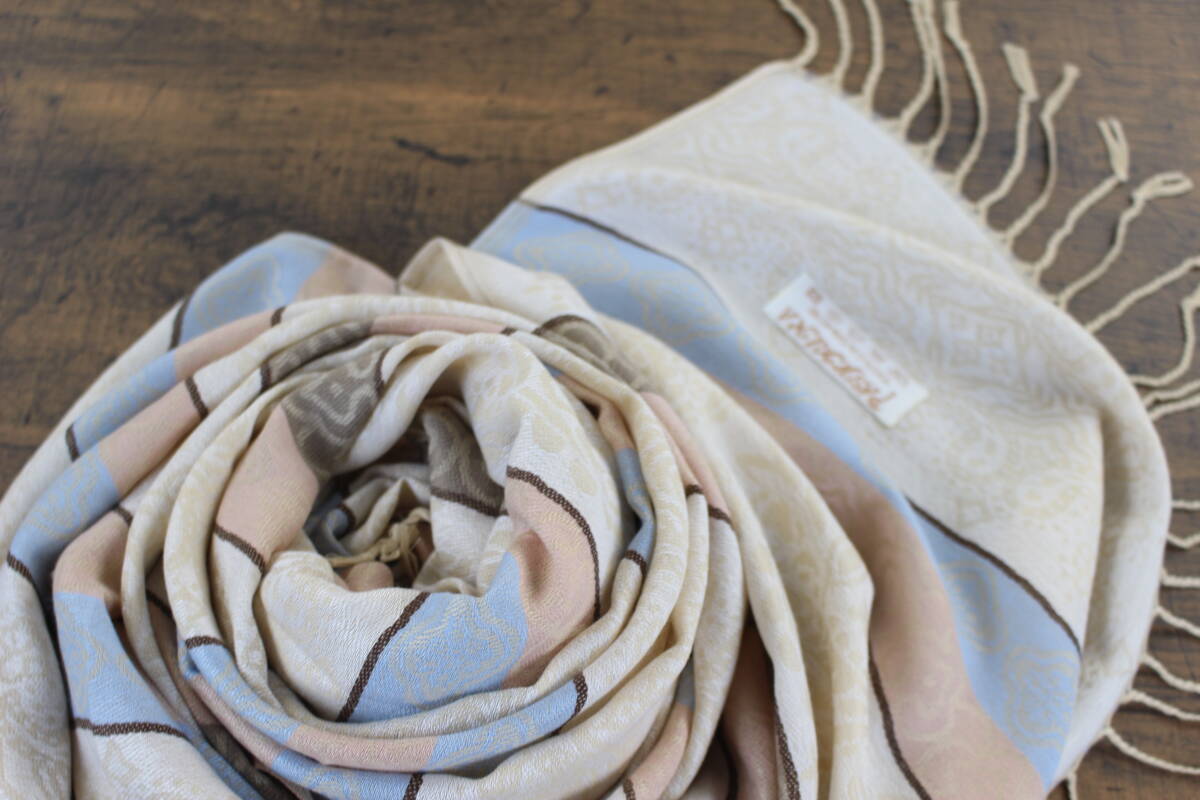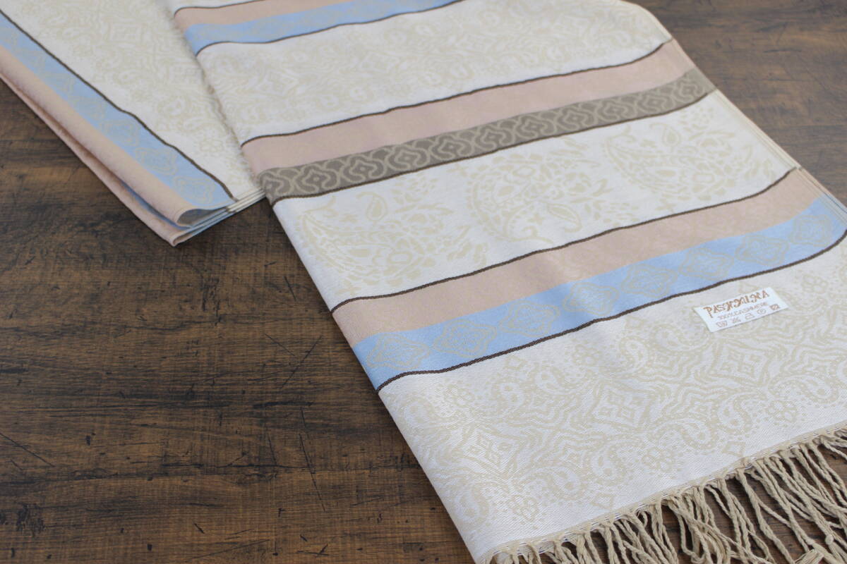 新品【パシュミナ Pashmina】フェアアイルペイズリー柄 ライトベージュ系マルチカラー BEIGE 大判 ストール カシミア100% Cashmere 訳あり