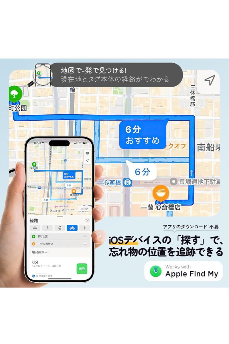 GPS高精度測位のairtag:「GPS測位で高精度な位置情報をリアルタイム把握!iPhone/iPad/Macの「探す」ネットワークと連携、日本国内はもちろん海外旅行時も位置確認可能、距離に関係なく、『探す』機能で世界中どこでも正確な現在地を確認可能。音が聞こえない遠距離でも、地図上でピンポイント表示されます。」