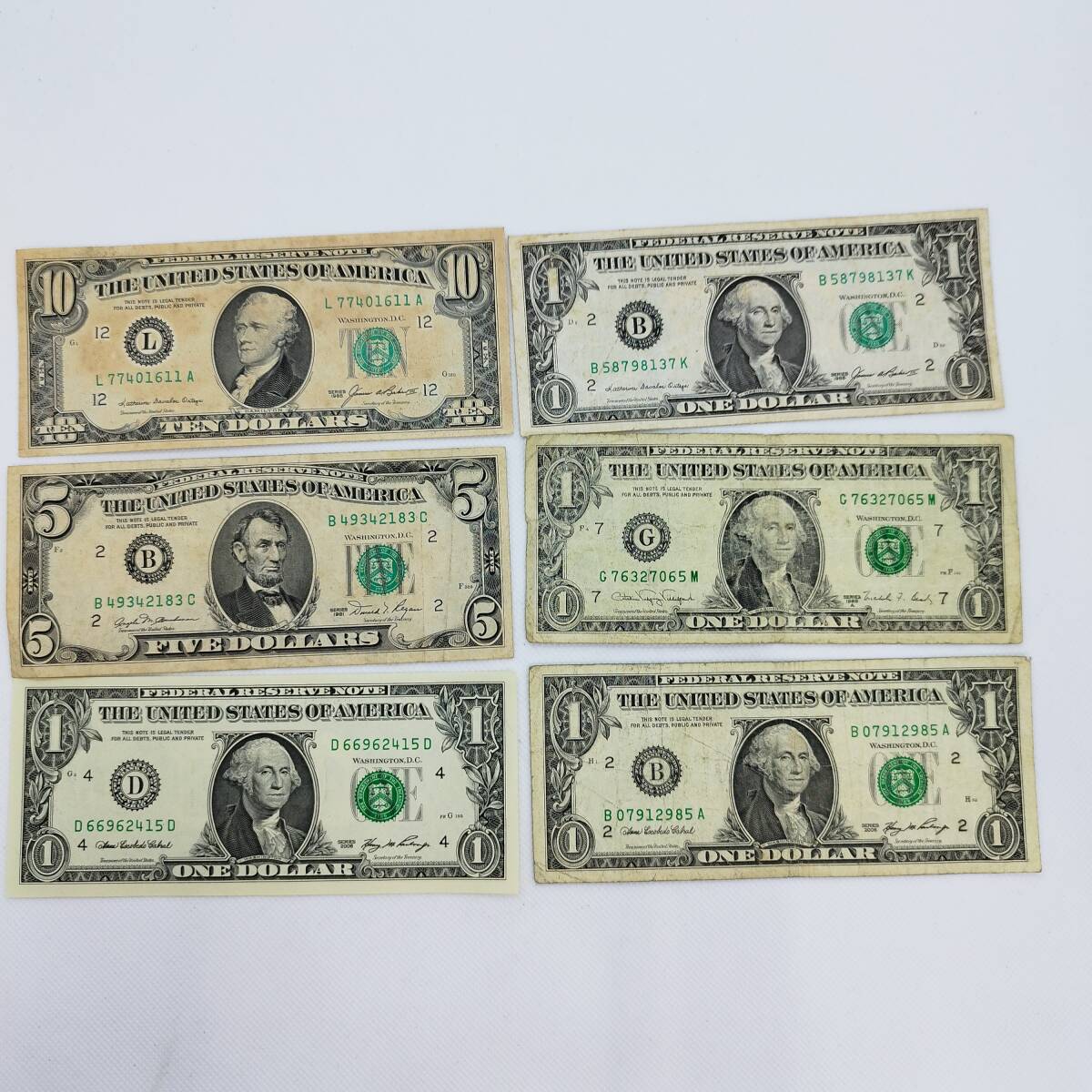 ♯954まとめ【ドル紙幣・19ドル分】10ドル札×1 5ドル札×1 1ドル札×4 19ドル分 コインセット | |