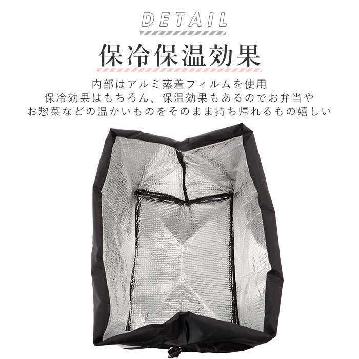 商品説明 | 自転車かごにすっぽり入り、レジかごのサイズでお買い物が楽になるバッグです。 上部は巾着になっているので、中身が飛び出す心配がありません。 また、内部はアルミ蒸着フィルムを使用し、保冷・保温バッグにもなるスグレモノ。レジャーにもおすすめです。 |