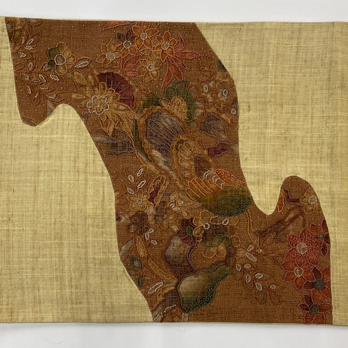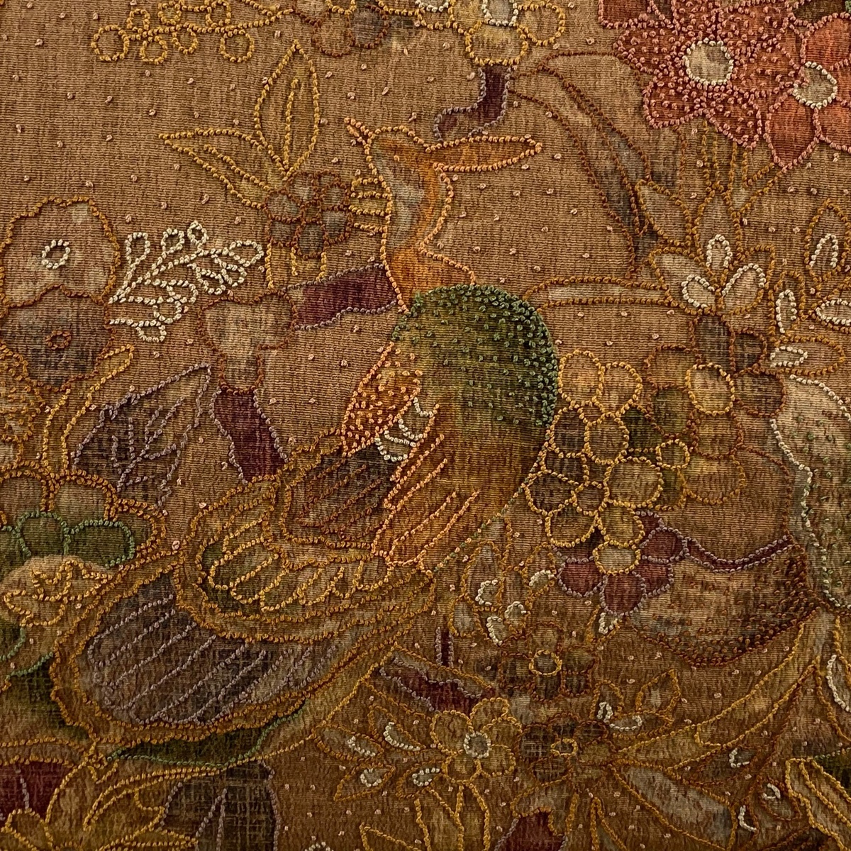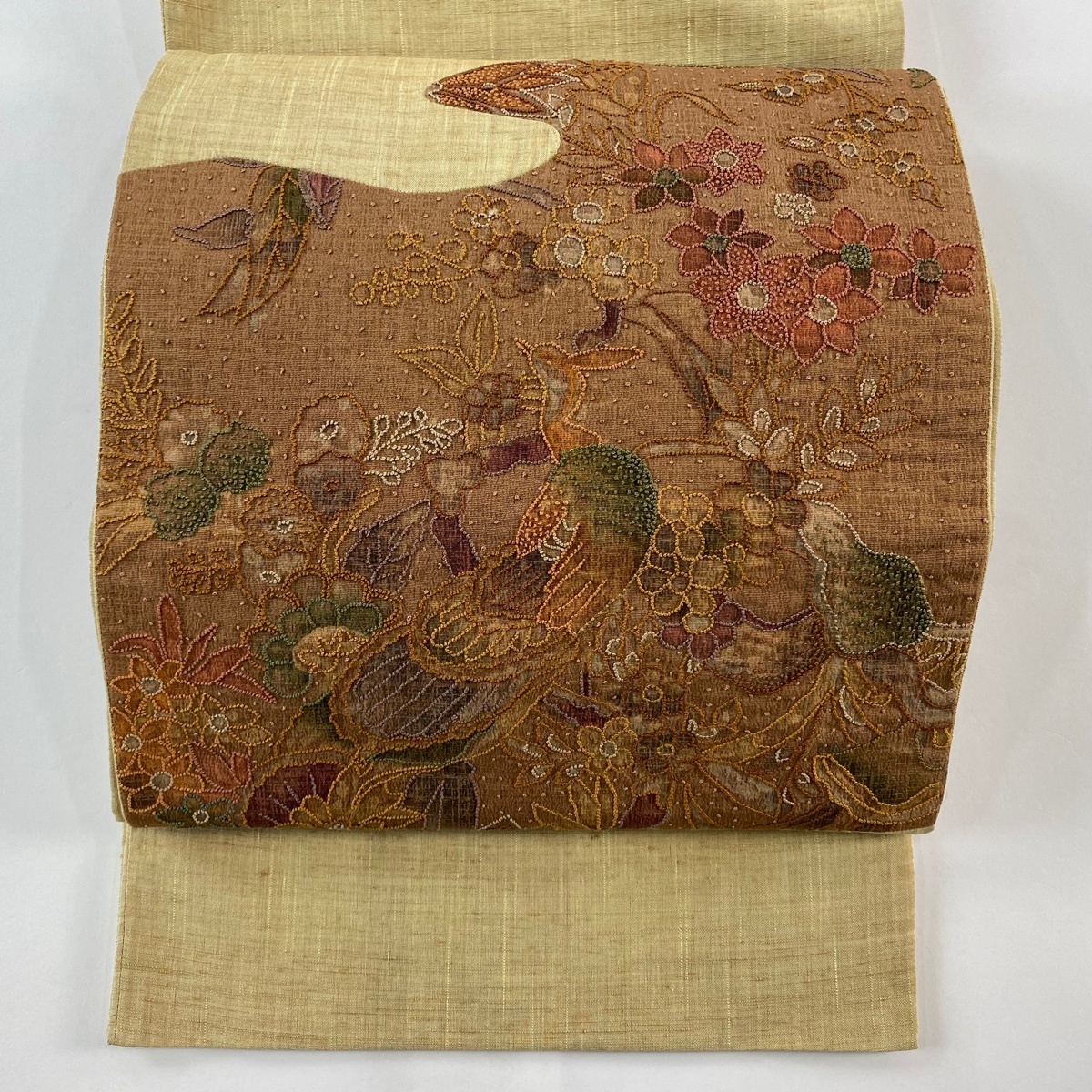 | 袋帯 美品 秀品 紬地 孔雀 草花 相良刺繍 赤茶 お太鼓柄 正絹 【中古】 |