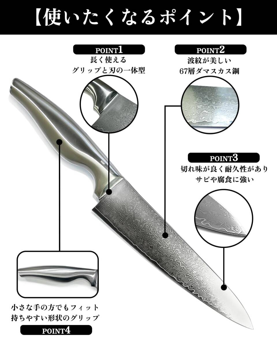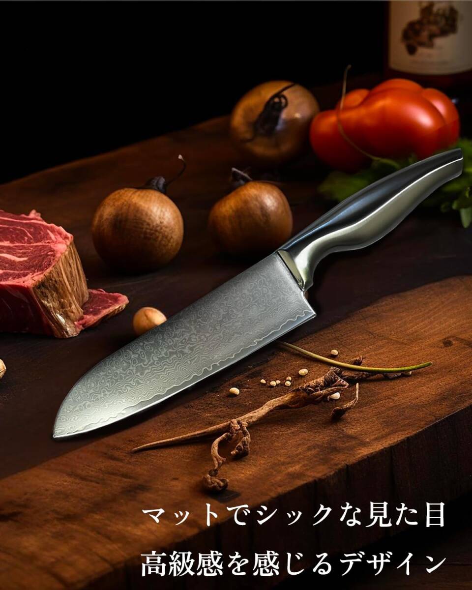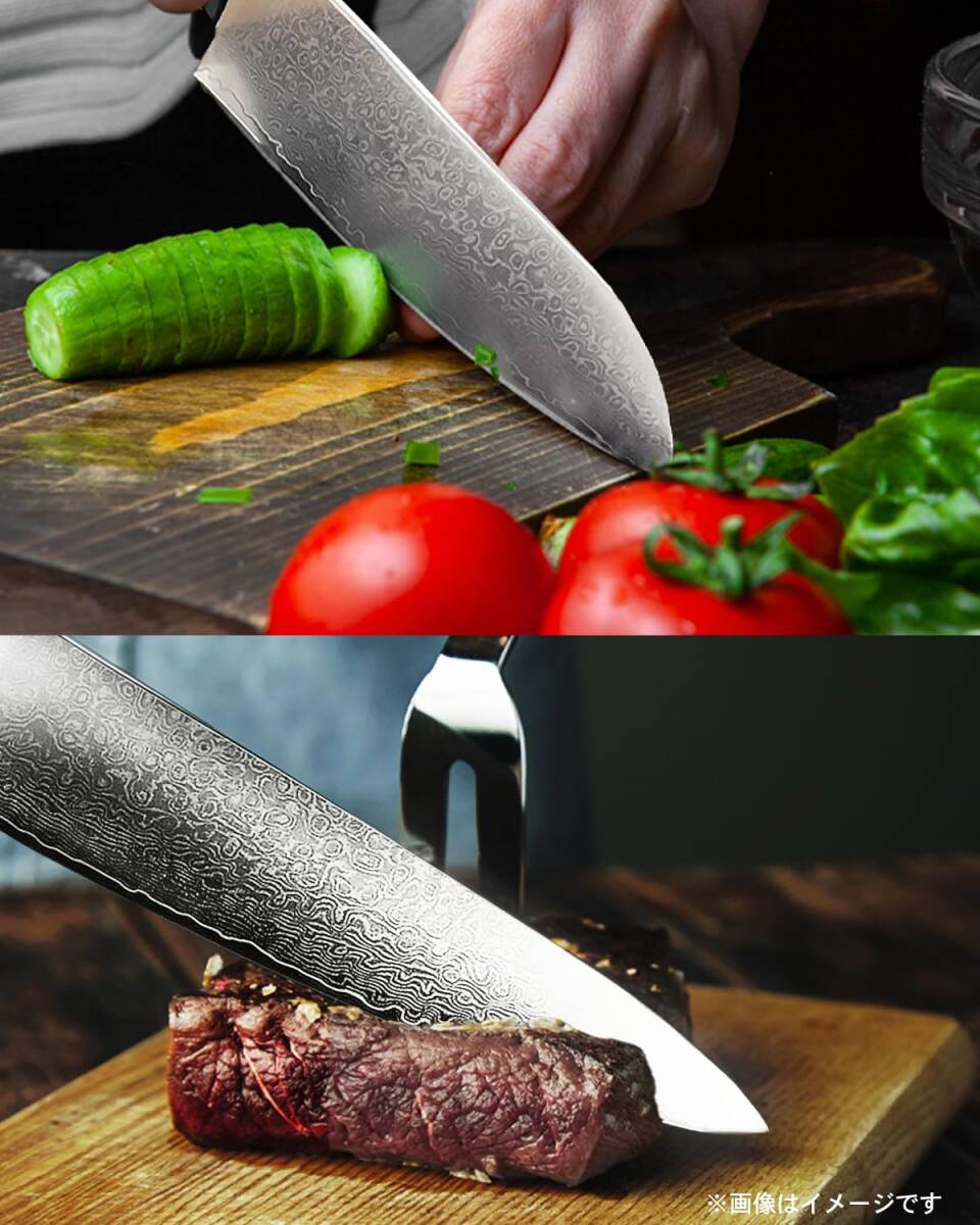 【高耐久・優れた切れ味】ダマスカス鋼とステンレス鋼を採用することで錆びにくく、腐食に強い製品に仕上げました。また、耐久性と切れ味にも優れており、肉や魚、野菜や果物など様々な食材のカットに向いています。