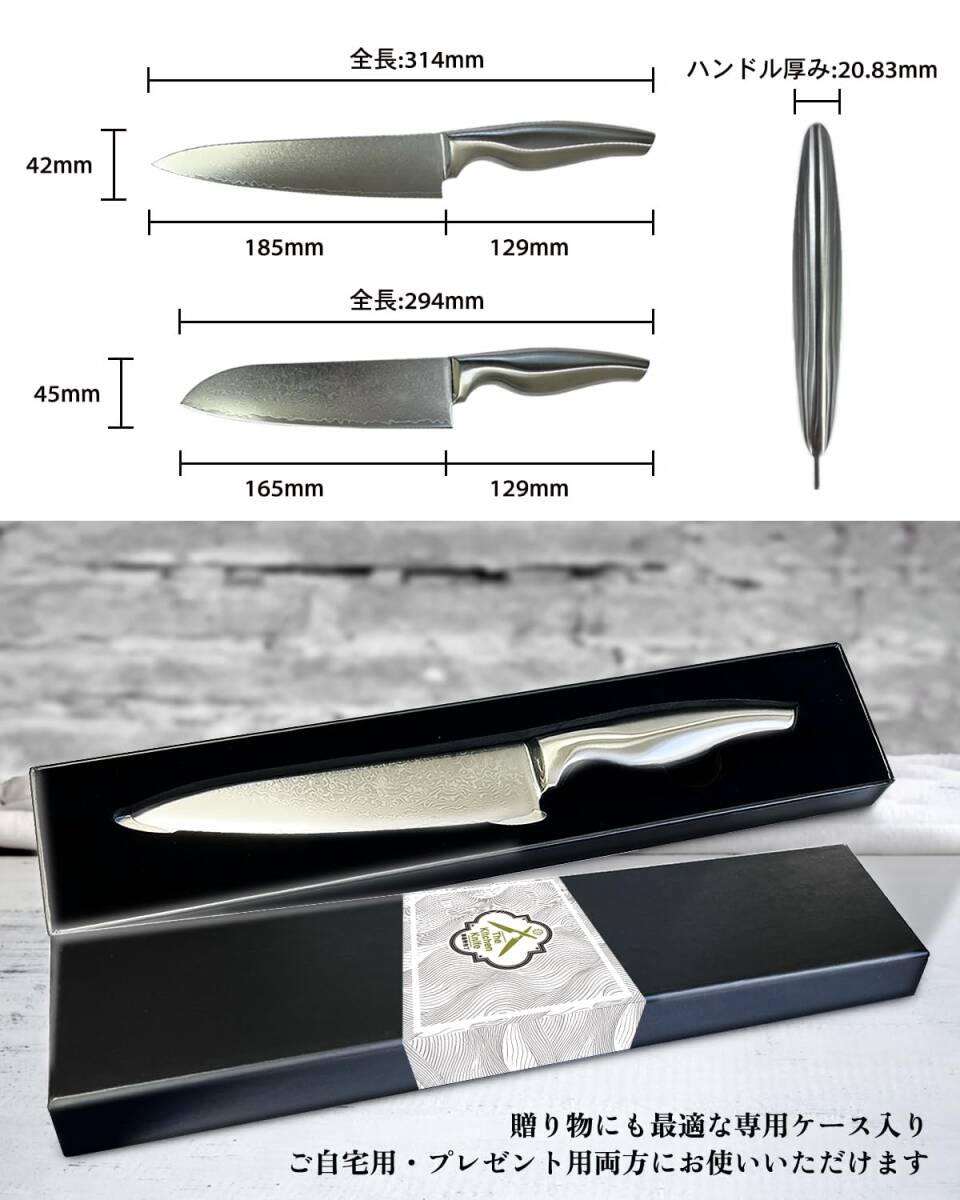 【セット内容】包丁、化粧箱 【サイズ】刃の長さ:165mm、柄の長さ:129mm 、厚み:20.83mm 【材質】本体:ステンレス鋼、刃の表面加工:67層ダマスカス鋼