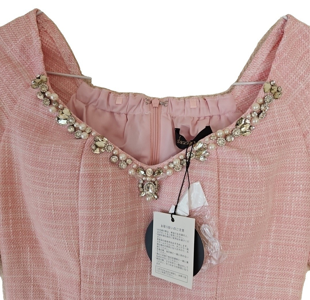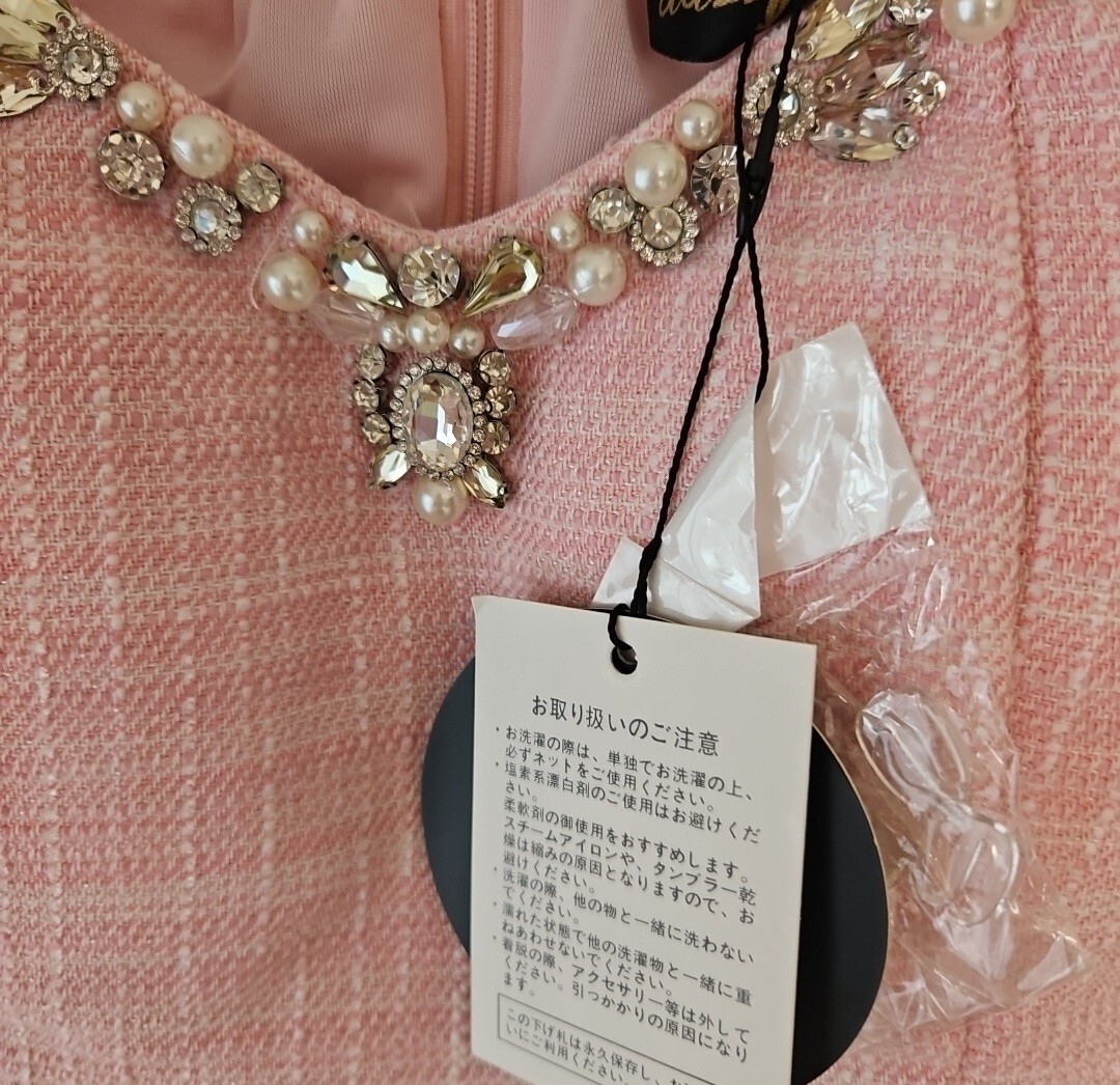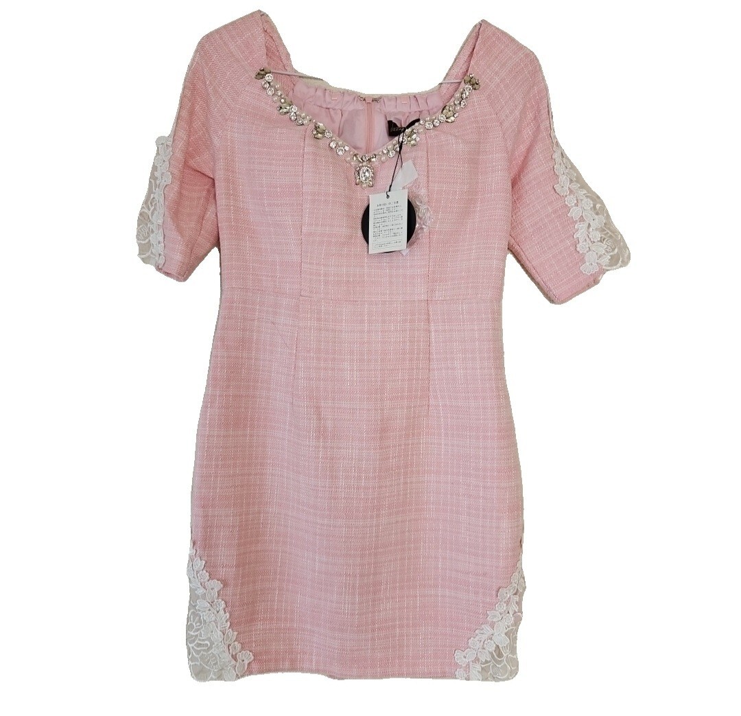 ツイードワンピースです。首元と袖、裾にあしらわれたビジューとレースが華やかさを演出します。新品未使用タグ付きの自宅保管品です。