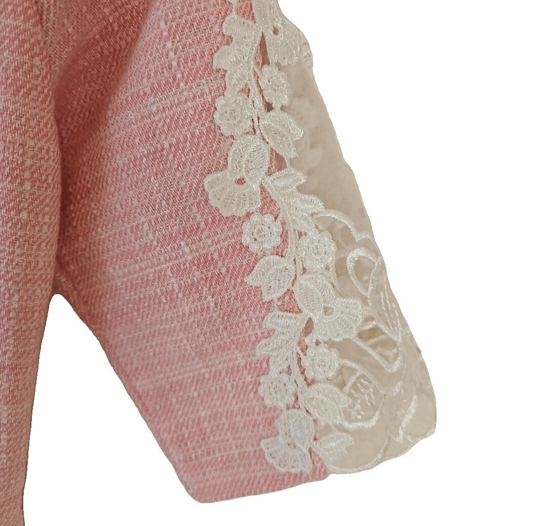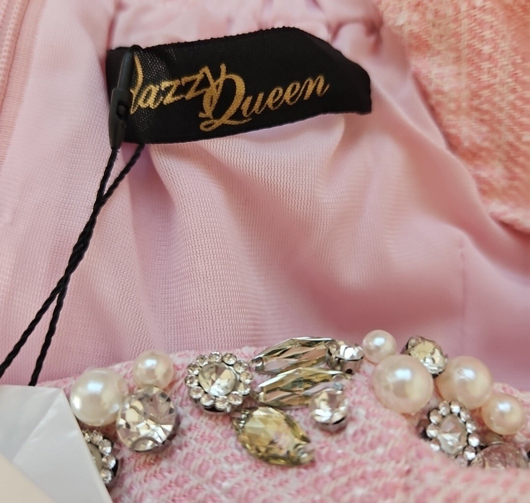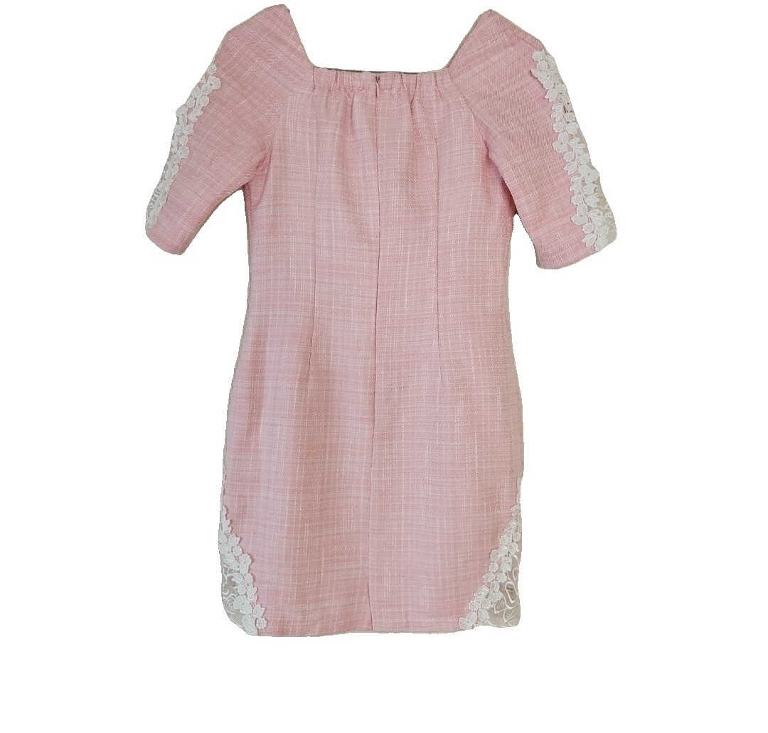 ツイードワンピースです。首元と袖、裾にあしらわれたビジューとレースが華やかさを演出します。新品未使用タグ付きの自宅保管品です。