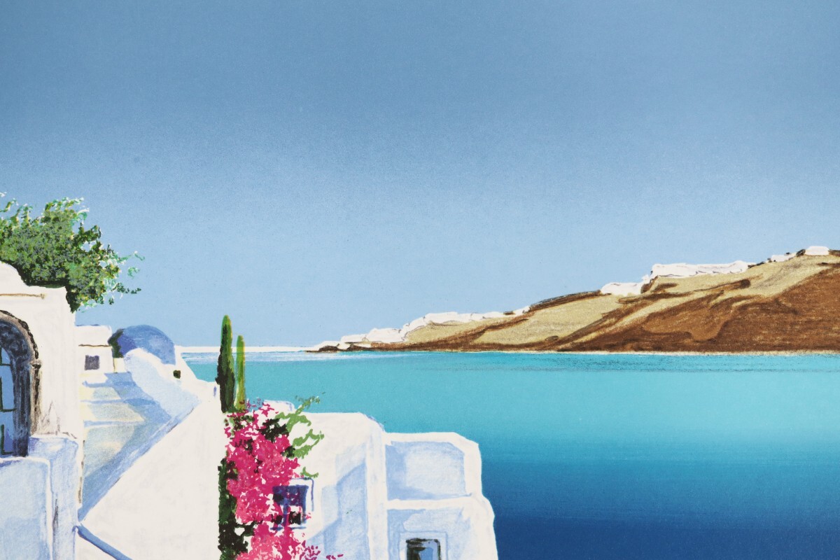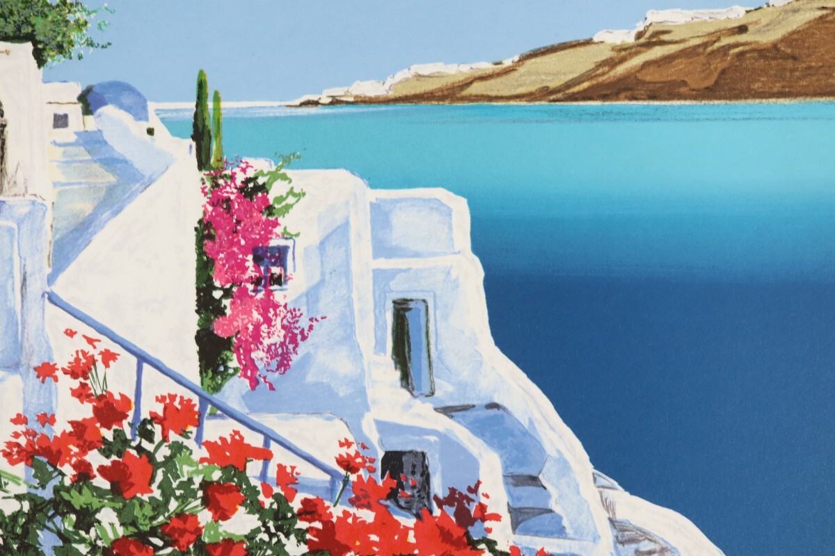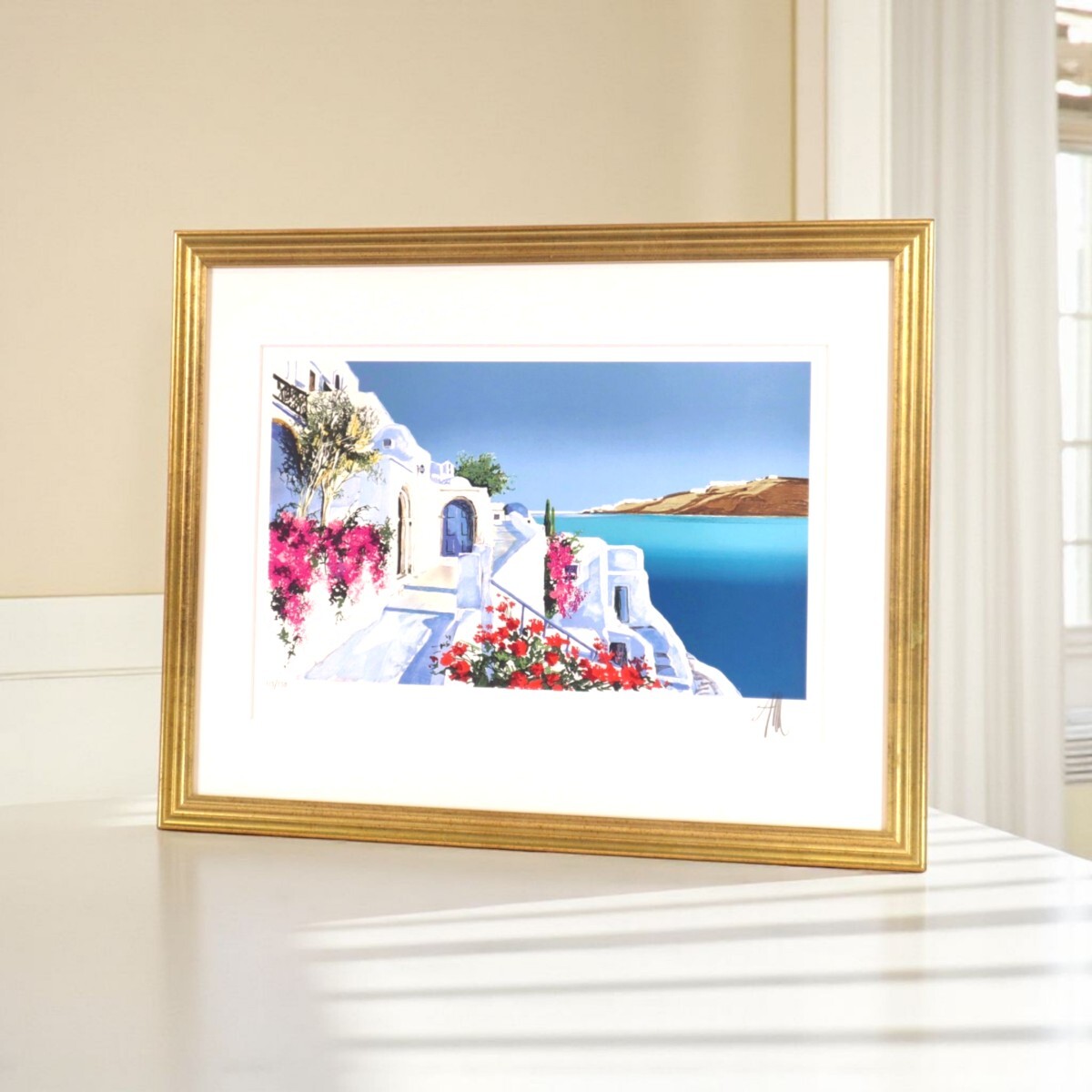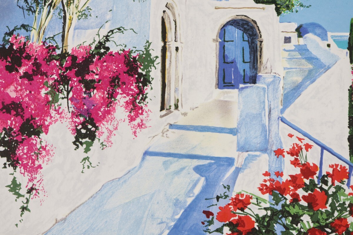 真作 アンドレ・ボンジボー リトグラフ「ギリシャ ブーゲンビリアの花」画 39×23cm 仏人作家 鮮やかな色彩感覚の白壁の家とエーゲ海 11541