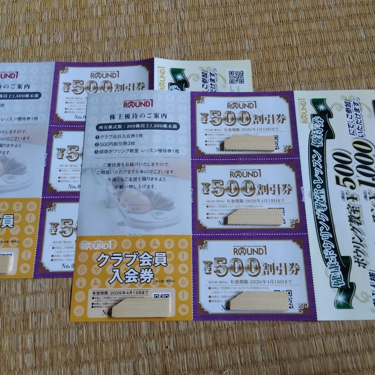 ラウンドワン株主優待券500円割引6枚 クラブ入会券2枚 ボウリング教室500円各種レッスン1000円2枚 有効期限2026/4/15 送料無料