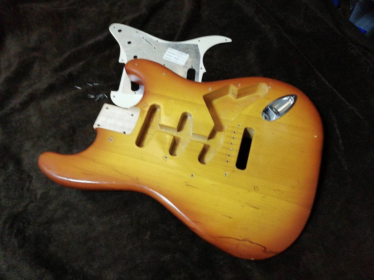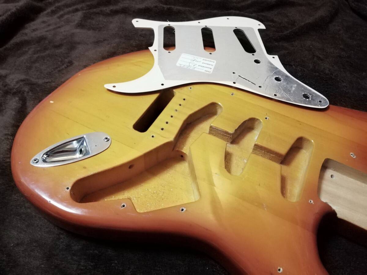 オーダーで作って頂いたストラトボディで、ピックガードはUSAのものを取り付け、