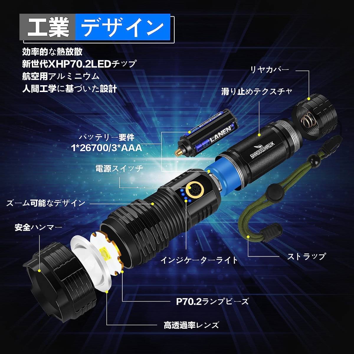 超強力 LEDフラッシュライト 懐中電灯 20000ルーメン IP67防水 XHP70.2 5モード&ズーム調節 防災/登山/夜釣り 日本語取扱説明書