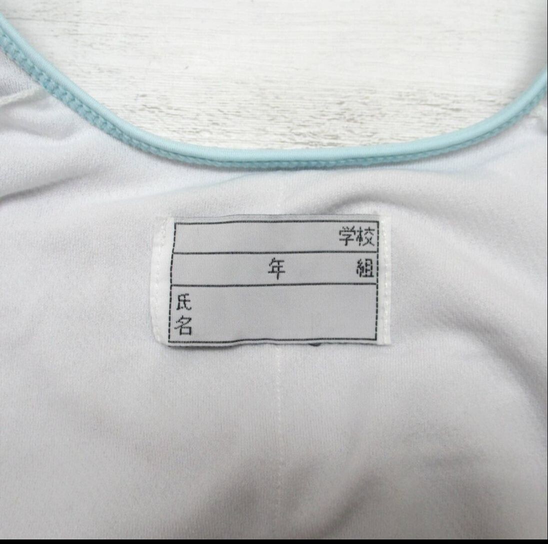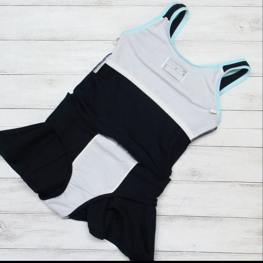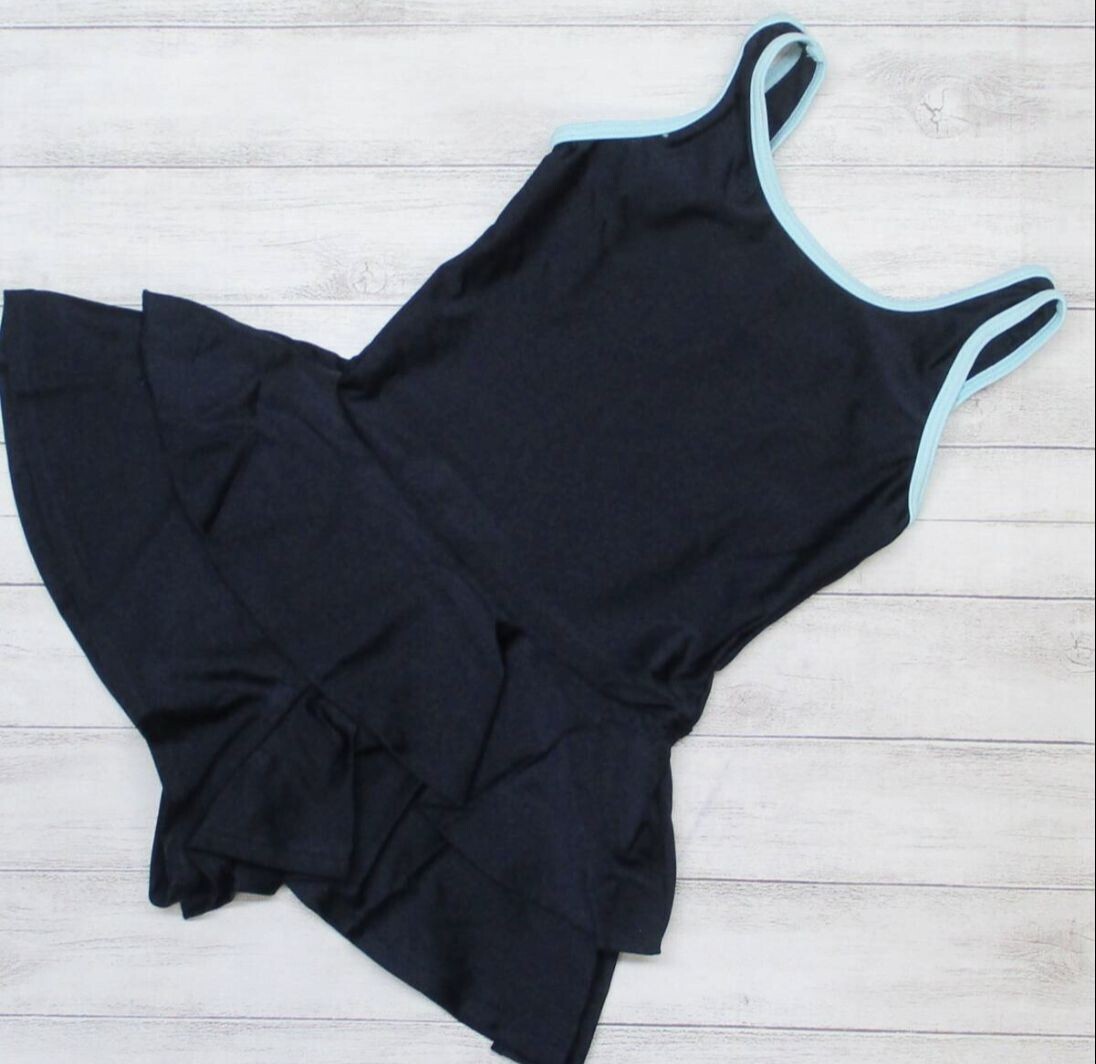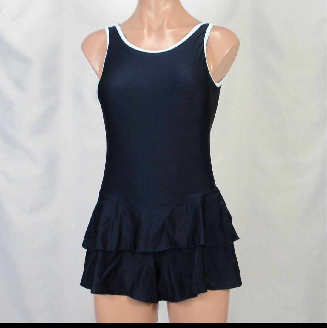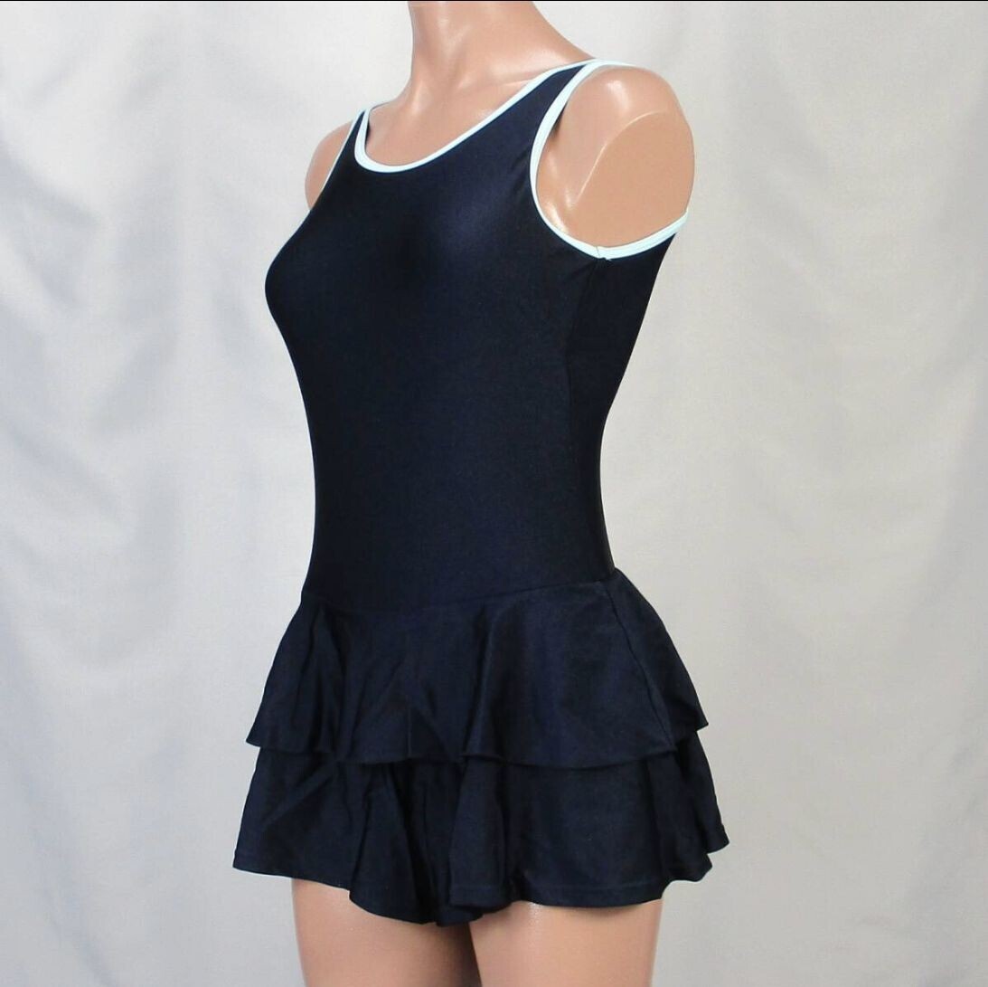 ネイビーのフリル付きワンピース水着、ストレッチ素材で動きやすいデザイン。