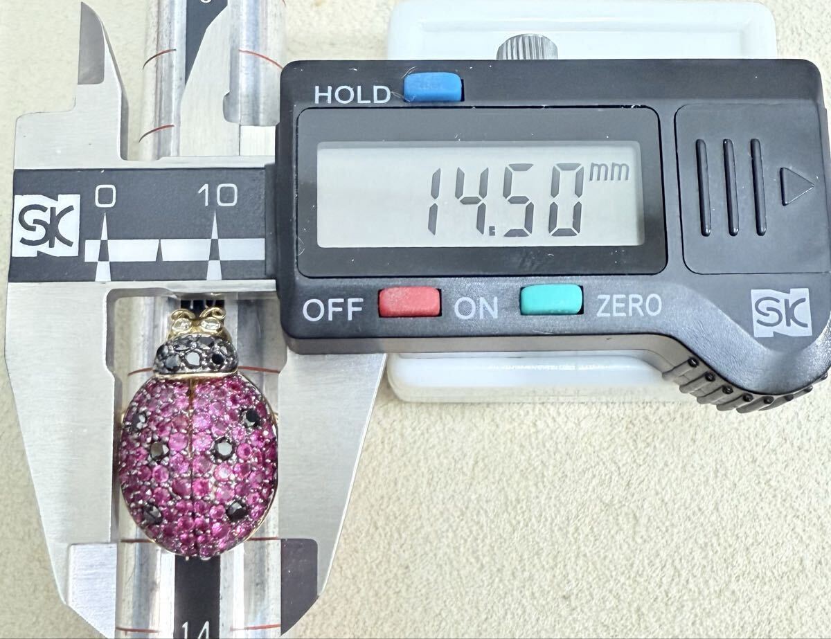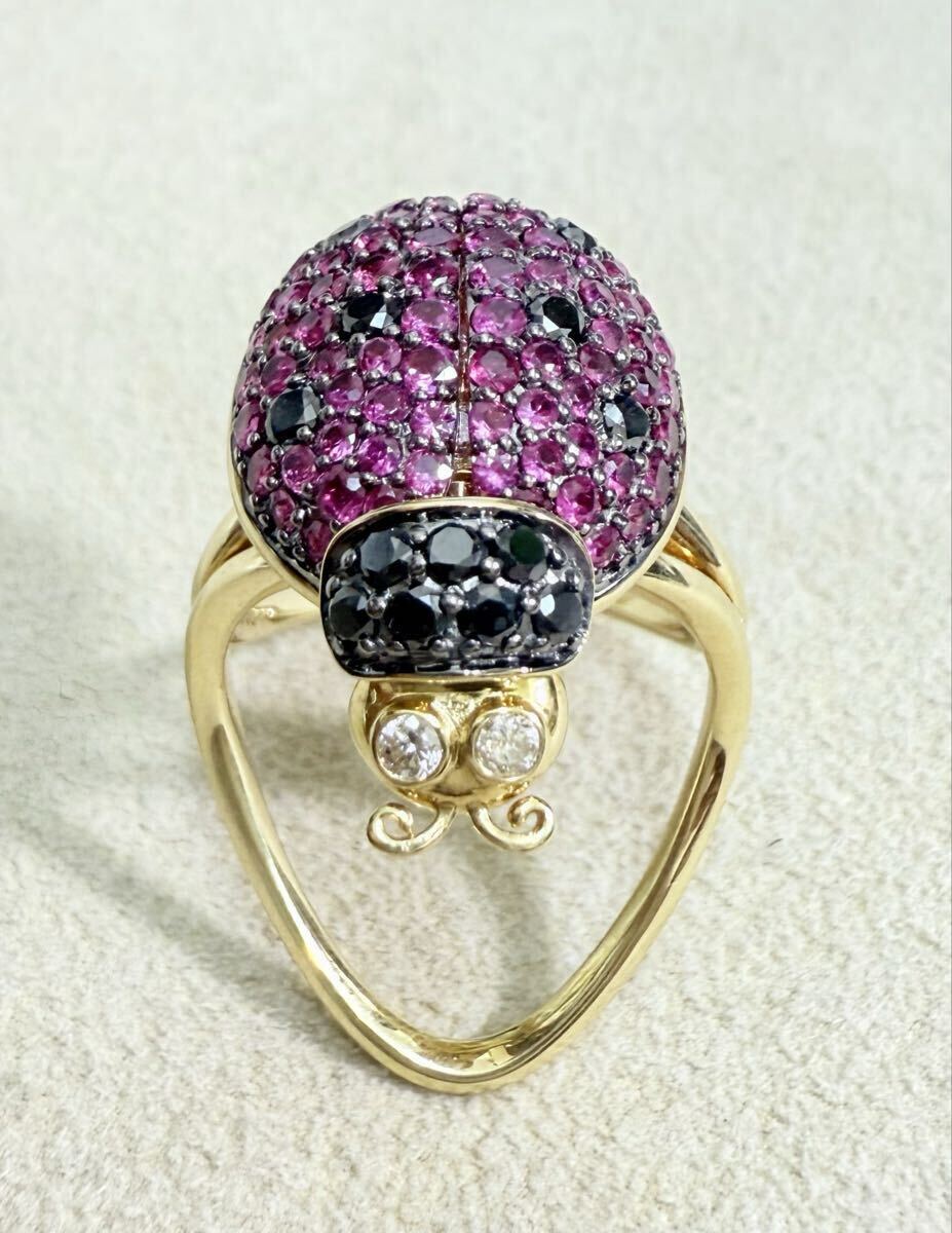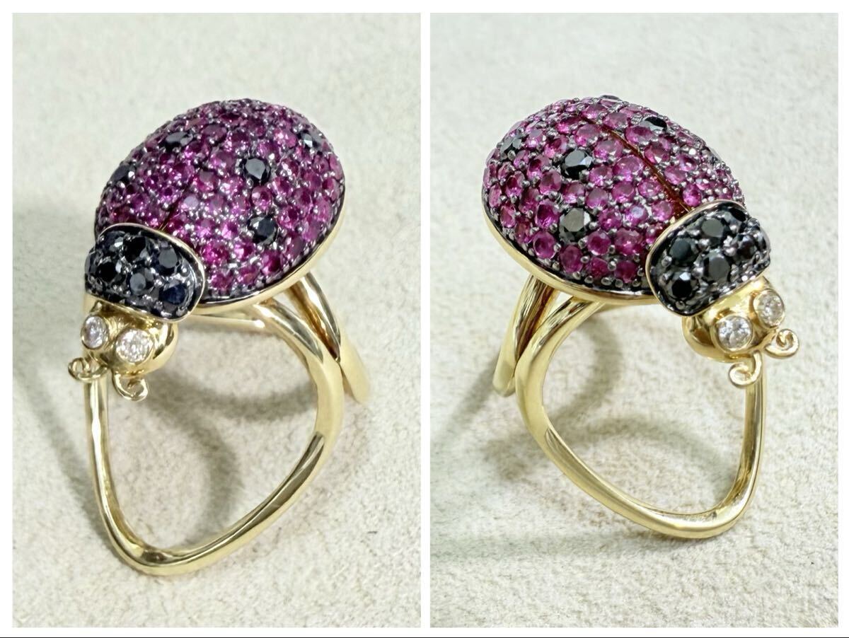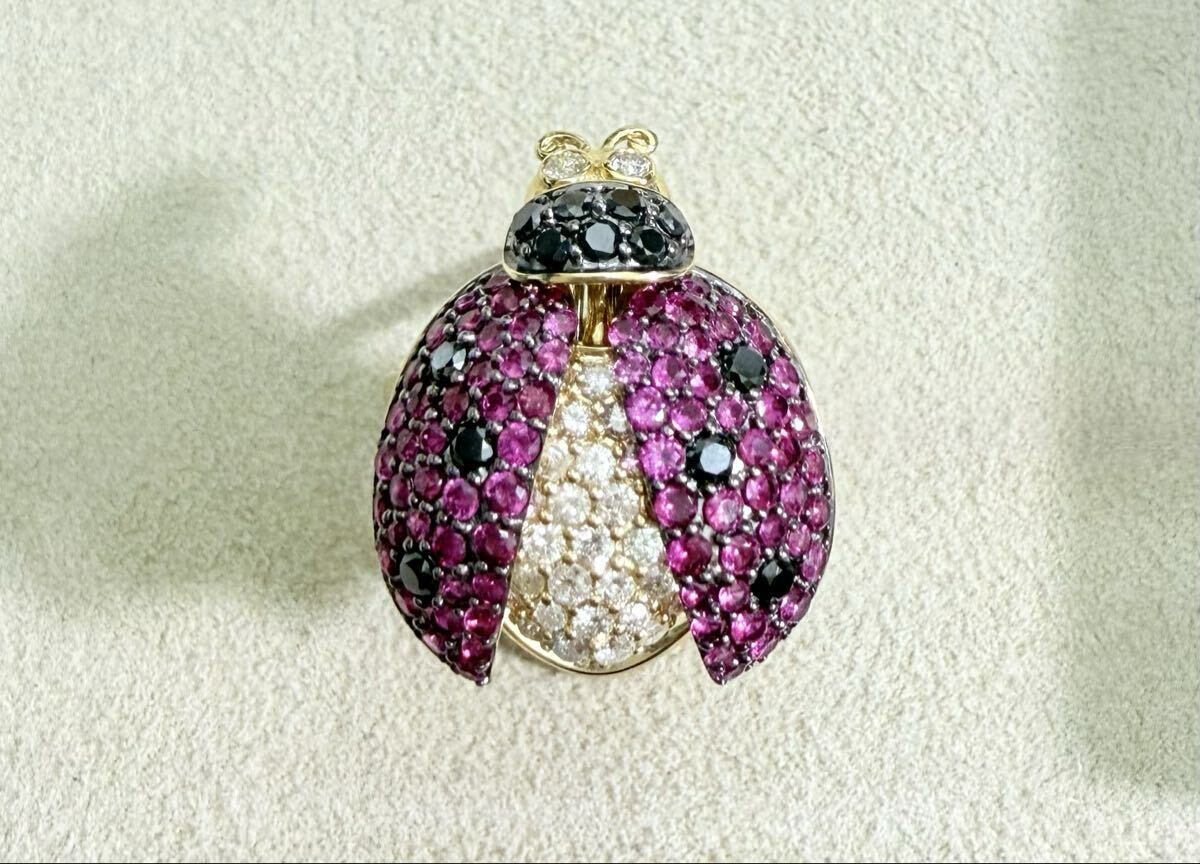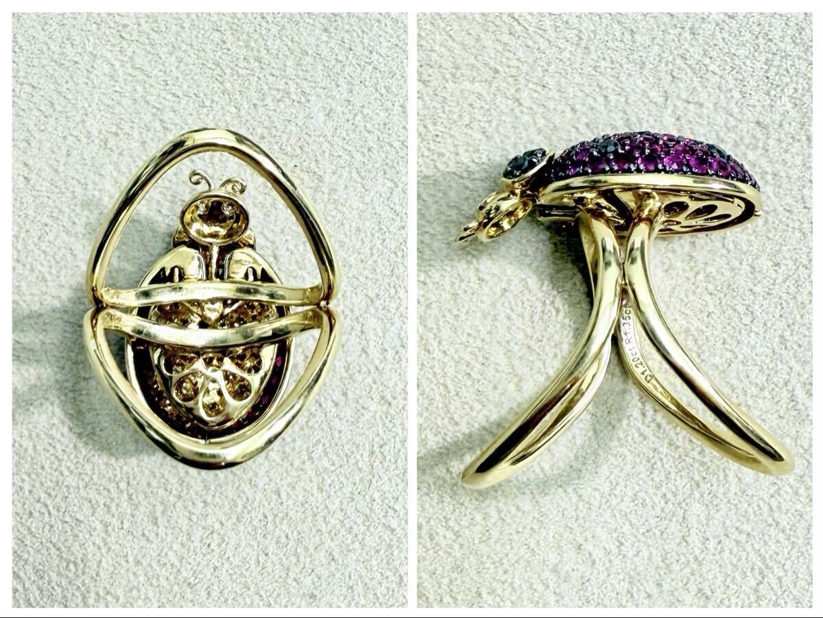 ルビーとブラックダイヤモンドのパヴェに、羽根が開くとダイヤモンドのパヴェが煌めくデザインです。