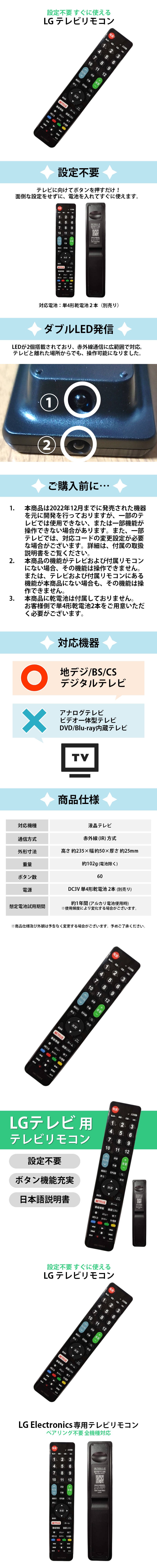 | LGの液晶テレビに対応したテレビリモコンです。互換品です。純正品ではございません。純正リモコンが壊れた 見つからない 効きが悪い スペア(予備)が欲しい 買い替えたい方にオススメです。■特徴設定不要ですぐに使えて快適2つのLED信号により広範囲で操作可能太字で表示された押しやすい大きなボタン純正品とほとんど同じ配置で違和感無し軽量で手にフィットして持ちやすい分かりやすい日本語説明書付き■商品仕様対応メーカー:LG Electronics,対応機器:2022年12月以前に生産された国内向け赤外線対応液晶テレビ,通信方式:赤外線(IR)方式,外形寸法:高さ約235×幅約50×厚さ約25mm,重量:約102g(電池除く),電池:単4形乾電池 2本(別売り),内容物:テレビリモコン×1,※本商品に乾電池は付属しておりません。※製造工程の更新により、商品仕様及び外観は予告なく変更する場合がございます。※本商品はあくまで互換リモコンですので、機種によっては一部特殊機能が使用できない 一部ボタンが反応しない 純正品より反応が鈍い可能性がございます。上記を理由とする返品や交換は受付かねます。予めご了承下さい。 |