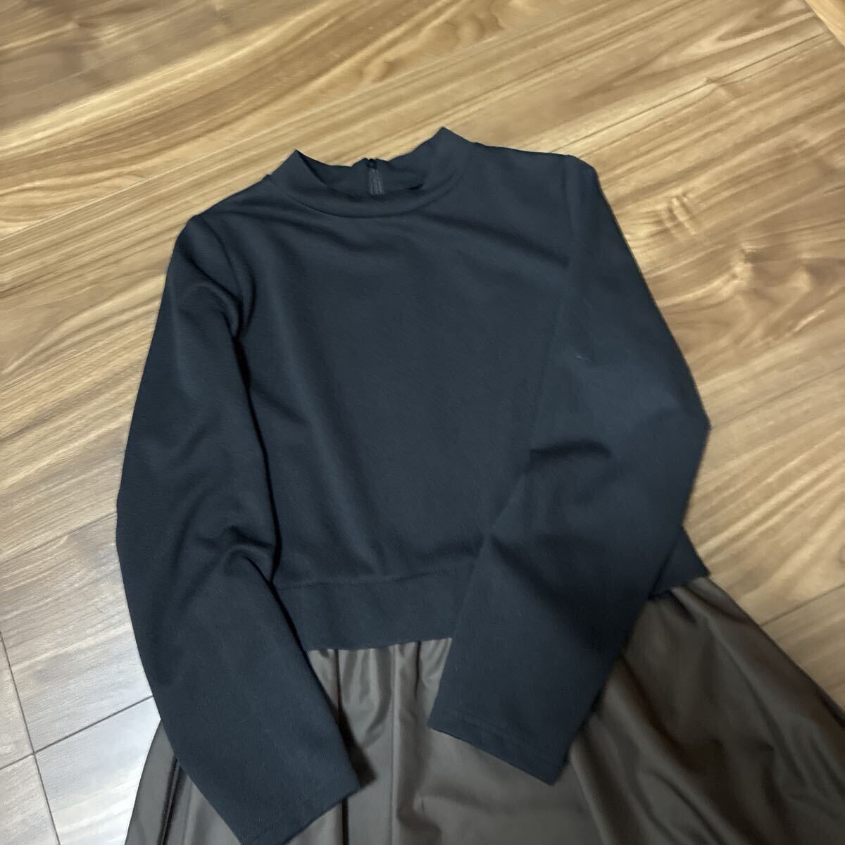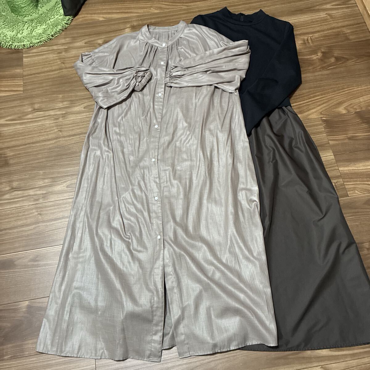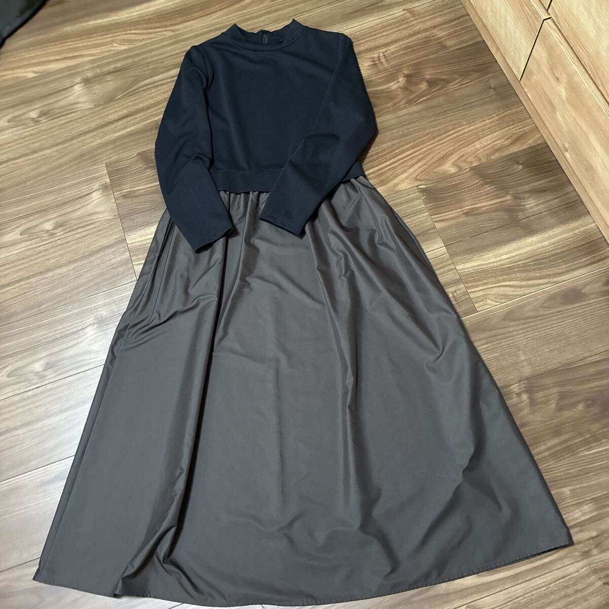 シャレル購入、切替ワンピース、着丈 120センチぐらい、脇の下あたりの身幅平置きにして43センチになります。上身頃がブラック、下が光沢のあるシックなブラウンになり、一枚で様になる上品にみえるワンピースになります。試着のみになります。去年の 1 1月に購入し、試着のみになります。