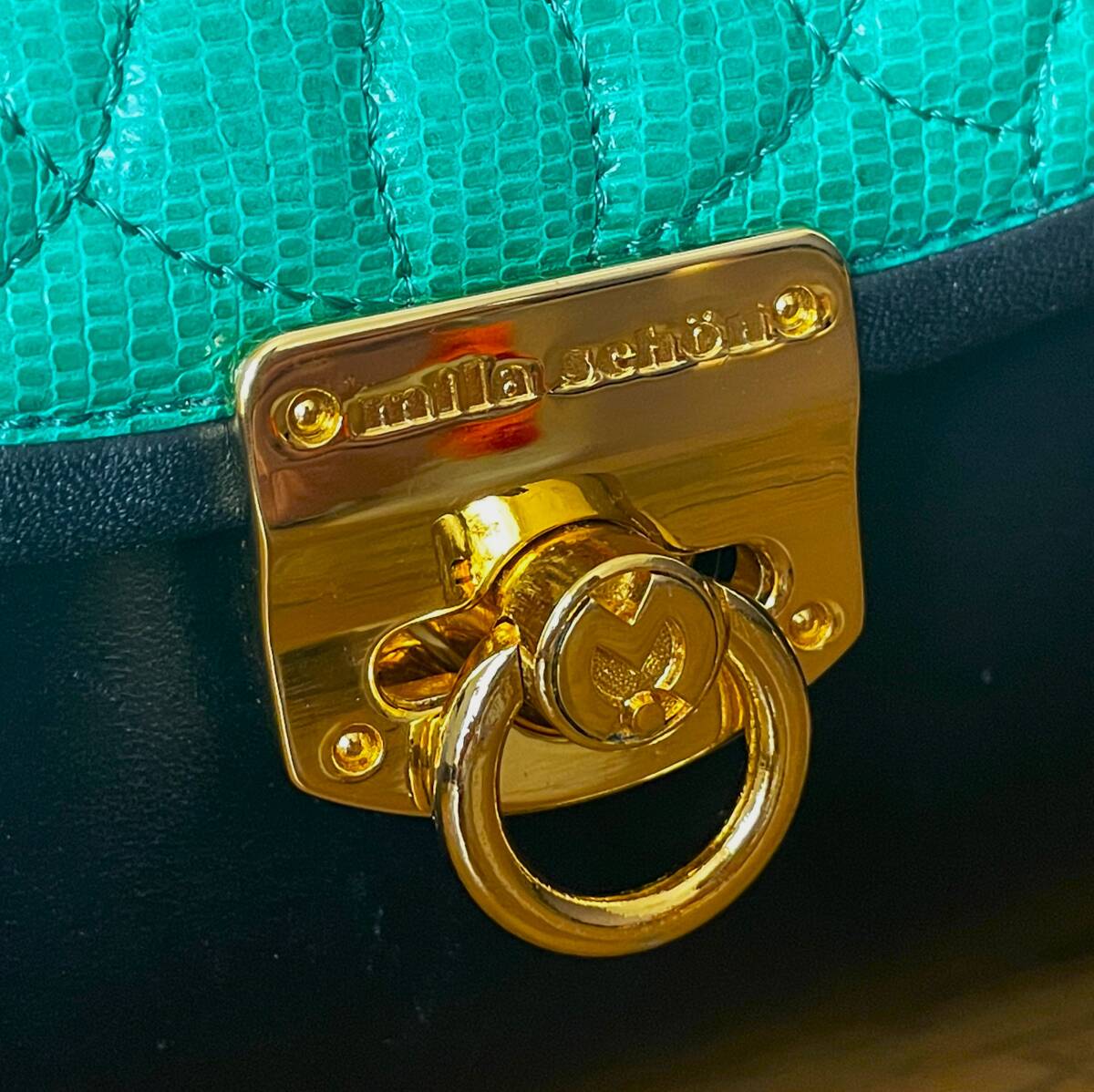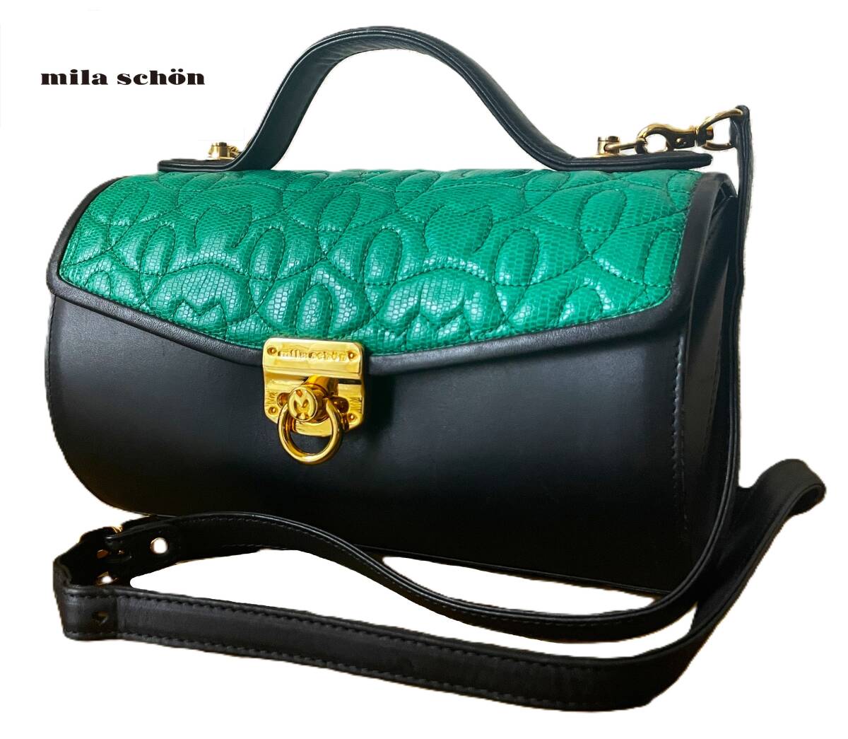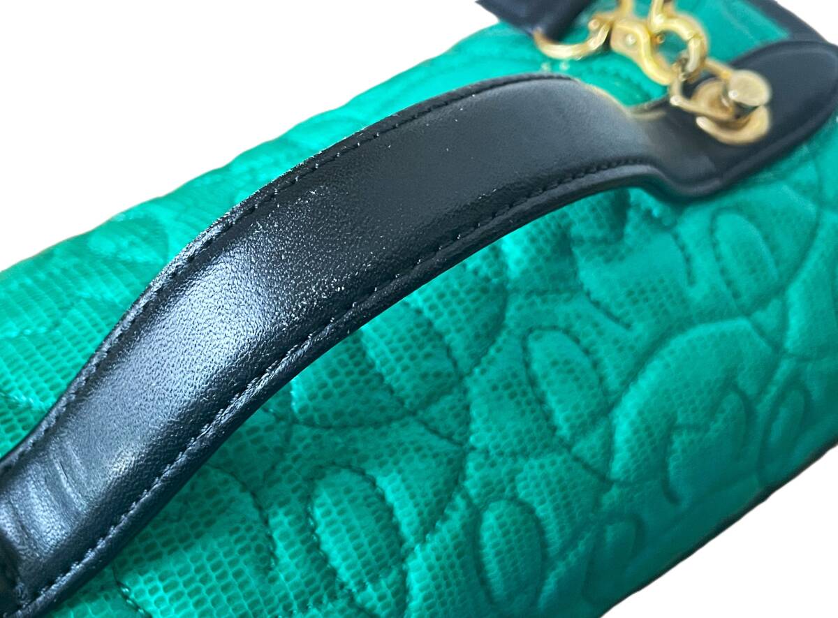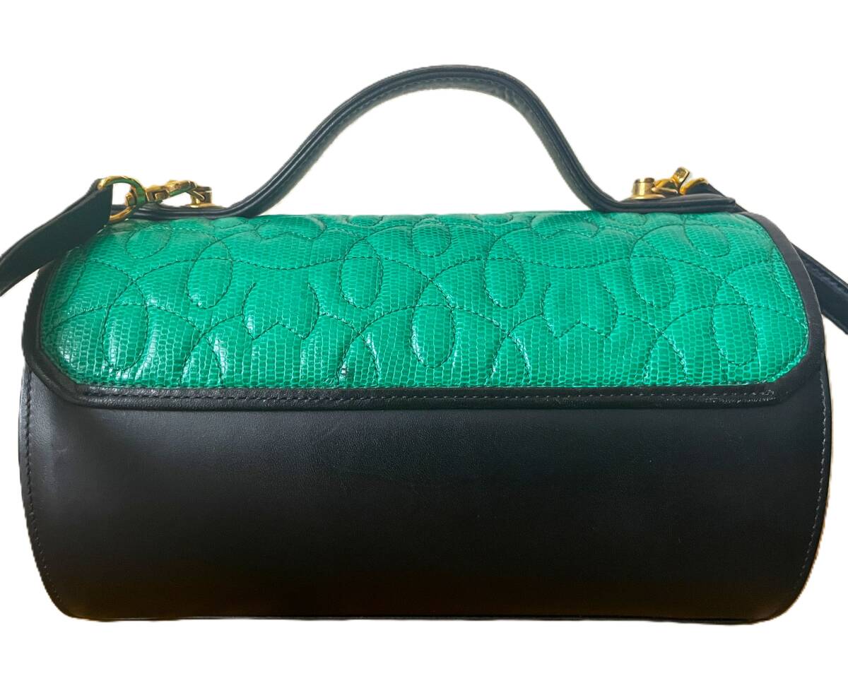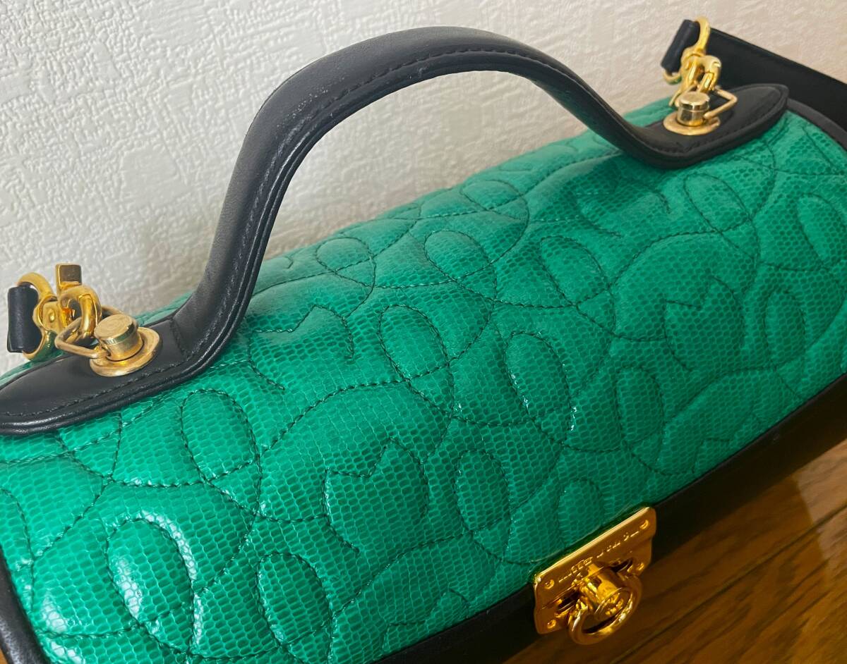 【ブランド】 mila schon ミラショーン 【デザイン・モデル】 本革 2WAY 斜め掛け ショルダーバッグ ハンドバッグ 【生産】 - 【詳細・コメント】 ミラショーンの2WAY レザーバッグになります。ハンドバッグと斜め掛けショルダーバッグとしてお使いいただけます。鮮やかなグリーンとブラック・ゴールドのカラーがとってもおしゃれで高級感があり、あまり見かけない希少なデザインです。お探しの方は是非この機会にいかがでしょうか。 正規品です。 【サイズ】 表記:- ※実寸を参考にして下さい。 平置実寸:高さ14cm 横幅24cm マチ幅12cm ショルダー:最大約114cm ※多少の誤差はご了承ください。 【カラー・パターン】 グリーン・ブラック・ゴールド ※ご覧になられるモニターや、デジカメの撮影具合によって色味が異なる場合がございますのであらかじめご了承ください。 【品質】 本革レザー(フラップのグリーン部分はリザードレザー型押しかと思います。) 【コンディション】 USED 中古品です。角スレ・レザー表面のスレ傷多数ございます。内側の底面に凹みの痕がございます(全て写真参照)。ですがその他に目立ったダメージ無く、致命的なダメージはございませんのでまだまだご使用いただけます!※写真参考に判断して下さい。ユーズドアイテムにご理解ある方のみご入札お願い致します 。 | |||