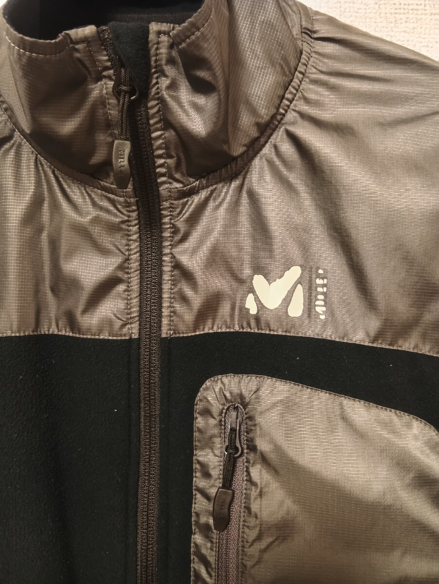 フリースとナイロンのコンビネーションで、ジッパー付きポケットを備えたスタイリッシュなアウトドアジャケット。