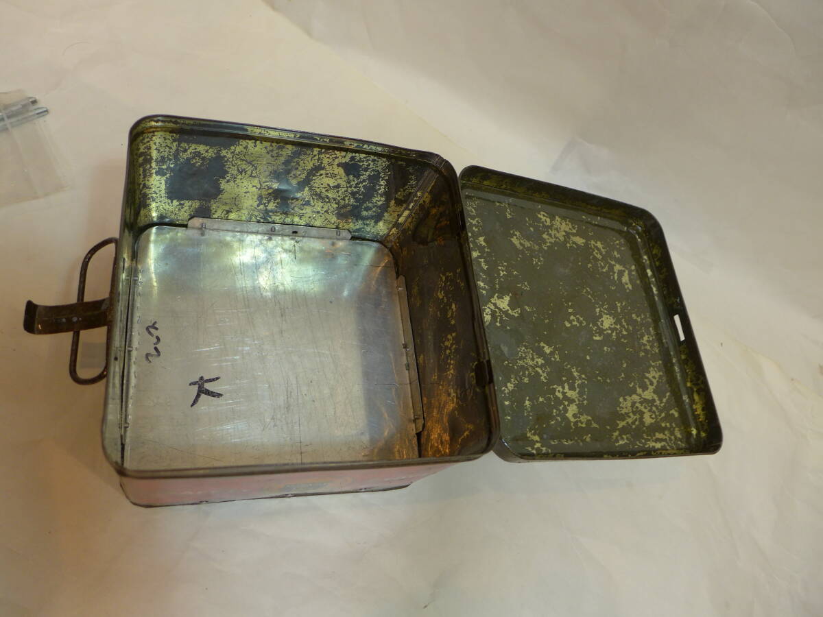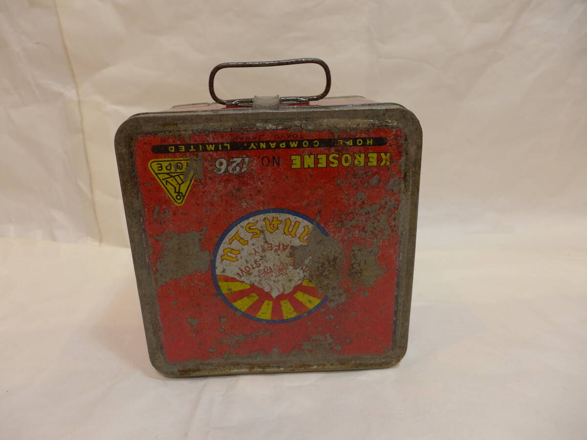 赤い缶はさびを取って、エポキシ系の塗料で錆止めとしています。丁番を取り換えて、底が抜けていましたので、