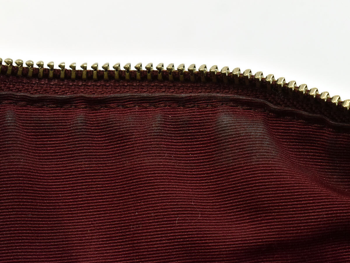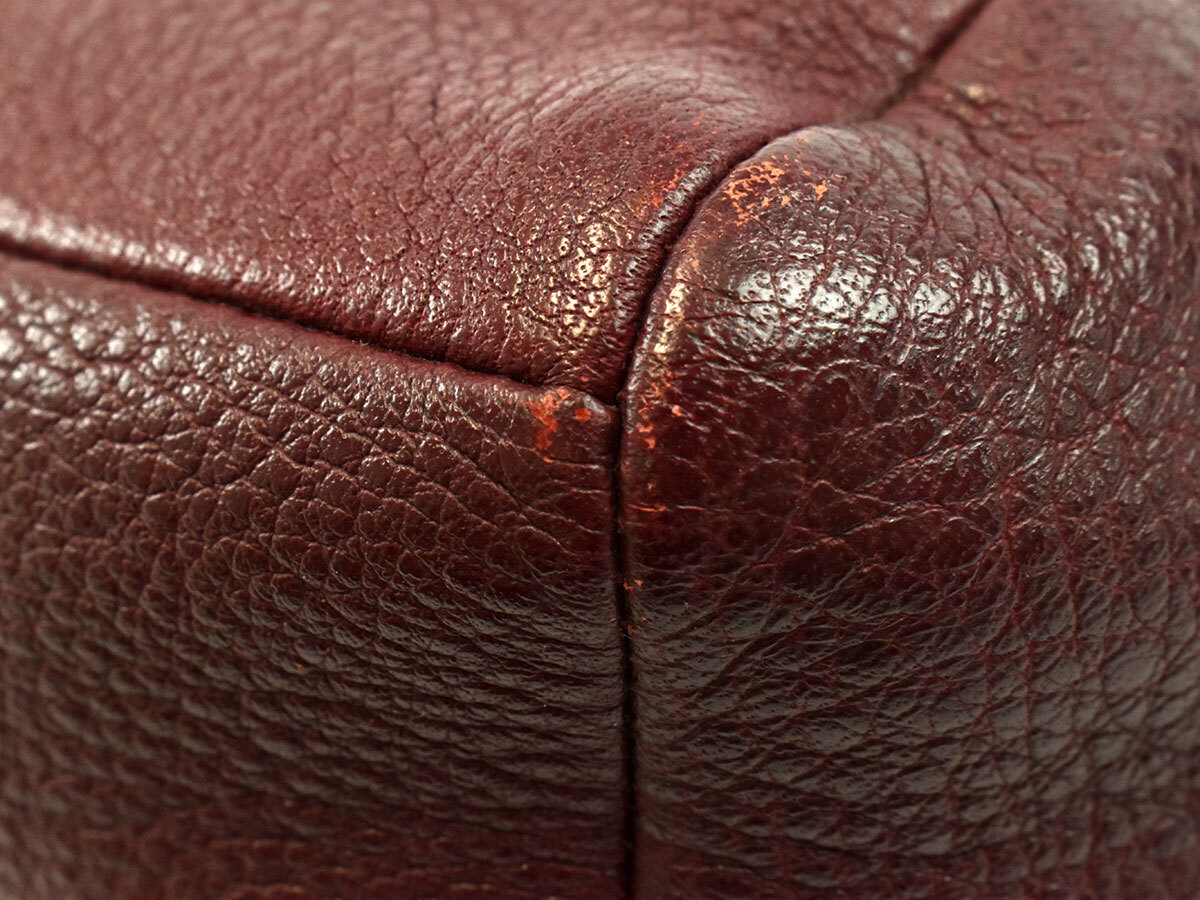 本体下部に折れグセ、外側開口部・角・持ち手・根革に剥がれ、内側にクスミ・ファスナー下にシミ、金具に小傷・メッキ剥がれがございますが、いずれもご使用には差し支えなく、まだまだお使いいただける商品です。 |