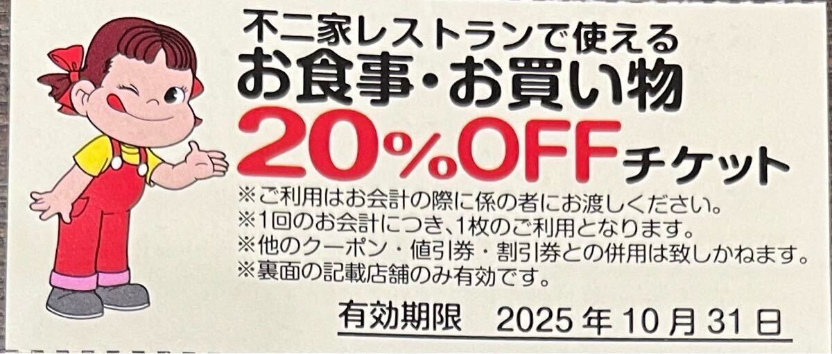 不二家レストランで使用出来るお食事お買い物20%OFFチケットです。有効期限は2025.10.31までです。