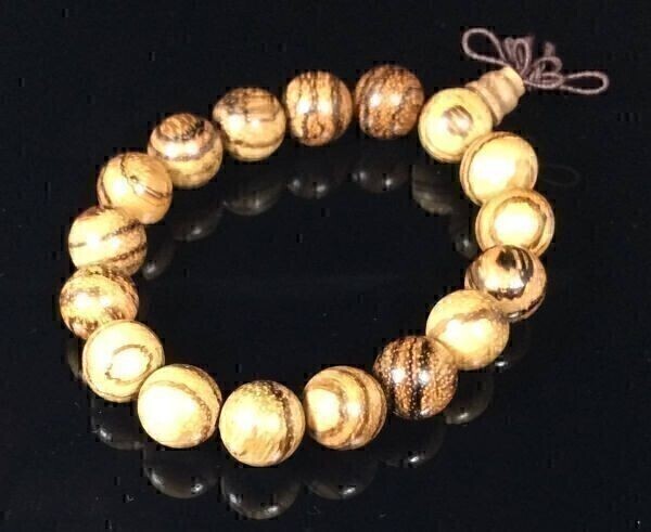 沈香はもともとたいへん希少で、近年ワシントン条約で収穫が禁じられたためほとんど流通がありまん。もしあっても20万円前後と高価です。この品物はベトナムで人工的に栽培されるもので、独特な栽培技術によって香りの高い逸品に仕上がっています。はずした後も微かに香るくらいの香りです。天然では虫食いや風雨による偶然的な防腐作用を待つのですが、ここ数年は人工的に樹脂化させる栽培沈香が主流で、こちらもそういう沈香です。それなりに高価ではあります。沈香の香りには鎮静効果があります。心を落ち着けたい時にピッタリです。いわゆるお数珠ではありません。男女兼用のブレスレットとしてお役立てください。