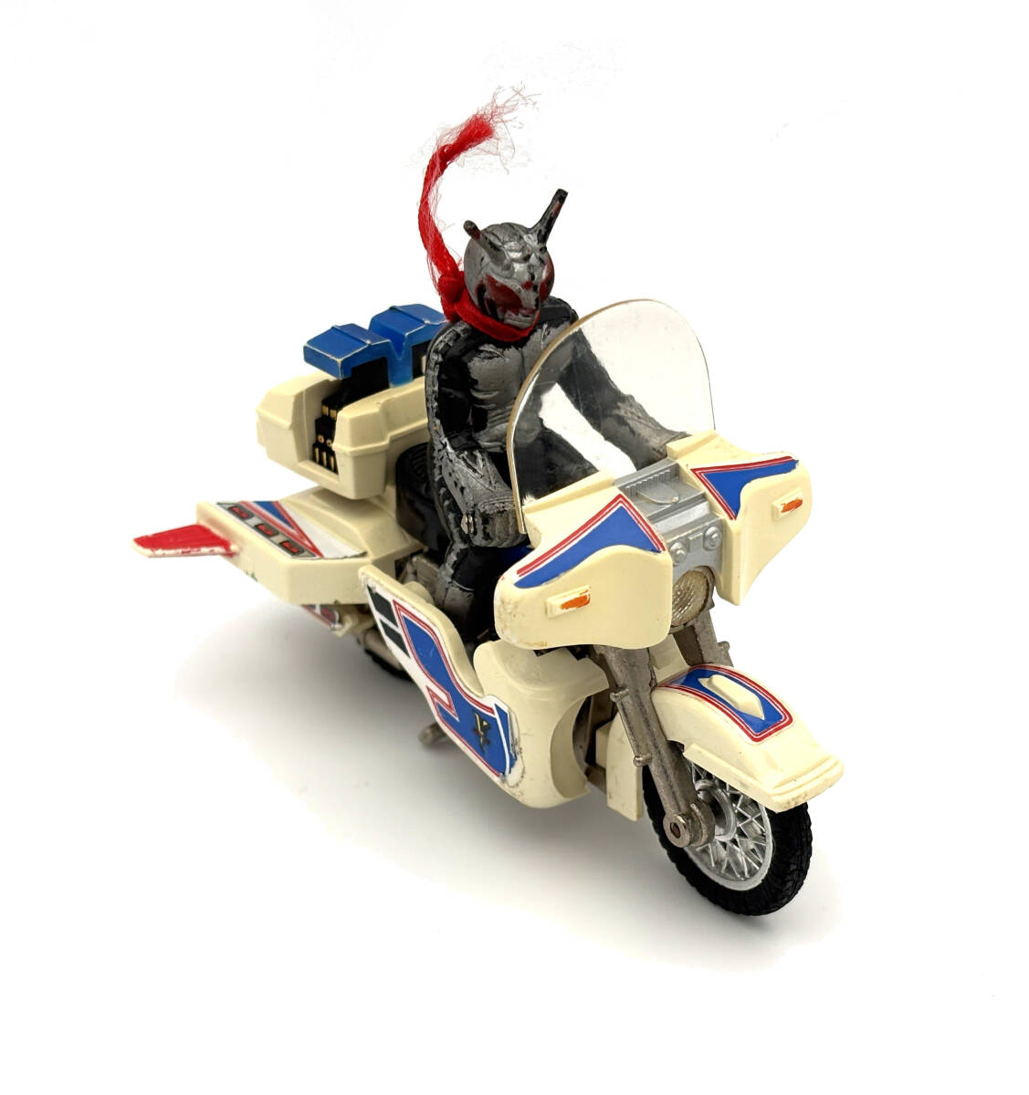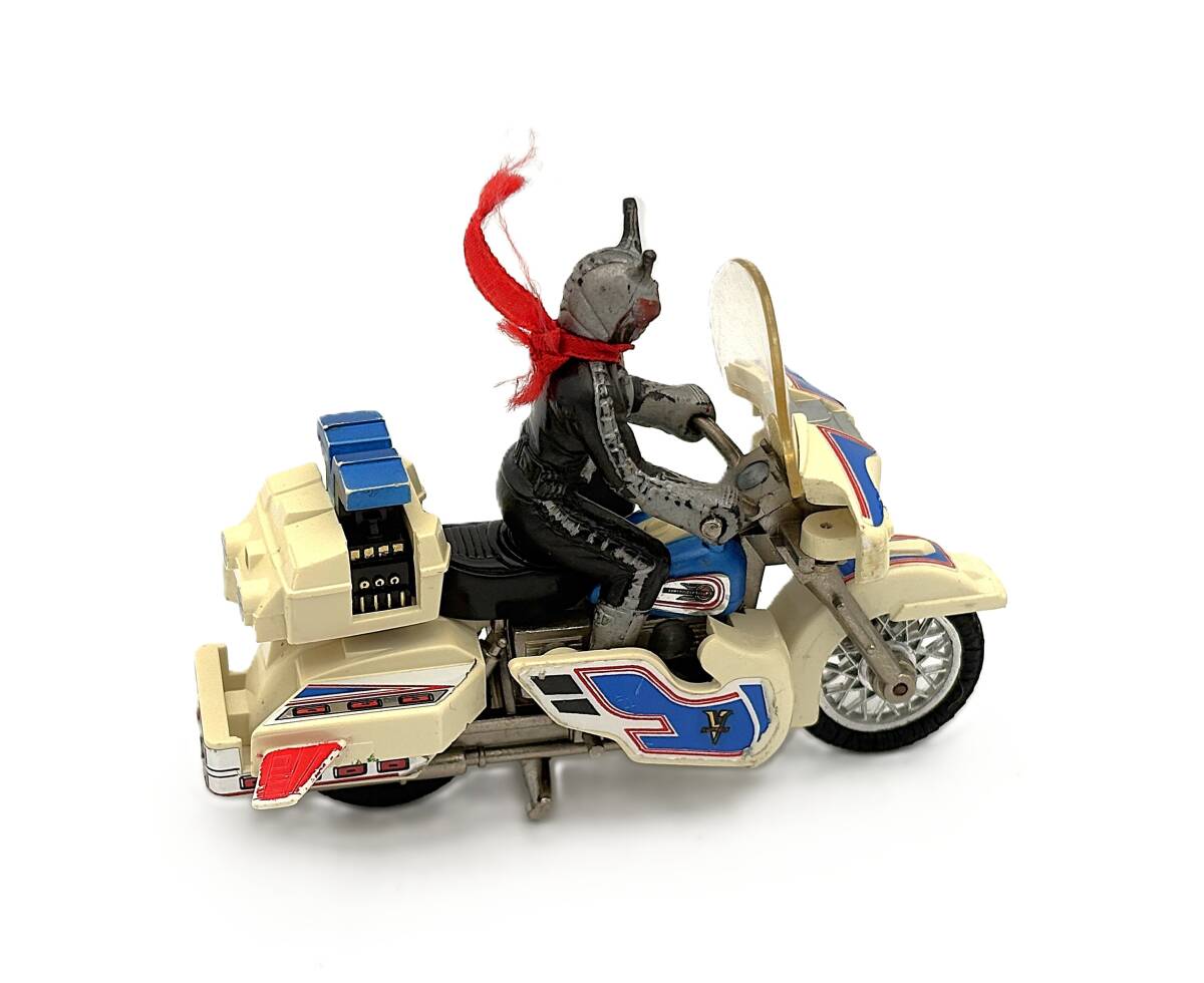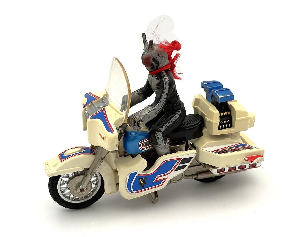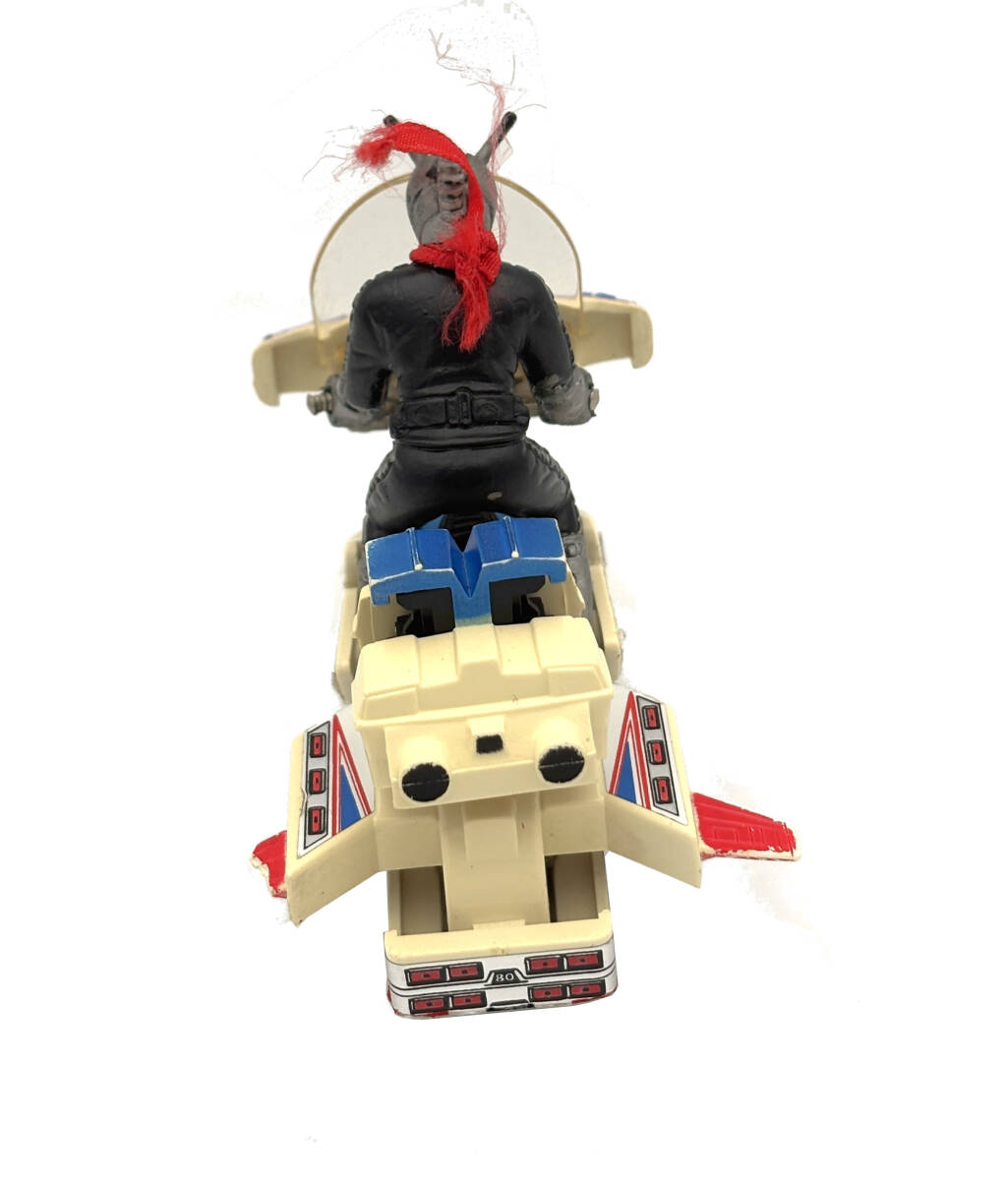 経年による黄ばみ、塗装の擦れ、使用感があります。バイクの後部フィンの1つが欠けています。仮面ライダーのビニールフィギュアが付属しますが、塗装の擦れがあります。オリジナルのスカーフも付属しており、使用感のある状態です。希少なヴィンテージアイテムで、コレクターにおすすめです。 Overseas buyers using proxy services welcome Kamen Rider Super 1 V-Machine PC-17 Chogokin. Some yellowing, paint wear, and general weathering. One of the bike’s rear fins is broken. Includes the Kamen Rider vinyl figure with some paint wear. Also includes the original scarf, in worn condition but complete, adding to the collectible value. Rare vintage collectible, highly recommended for collectors. 假面士 超1 V机 PC-17 超合金 因年代原因有黄、漆面磨和老化。摩托后部的一个片断裂。附假面士乙基人偶,漆面有磨。附原装巾,使用感明,但完整套装。稀有古收藏品,非常合收藏好者。