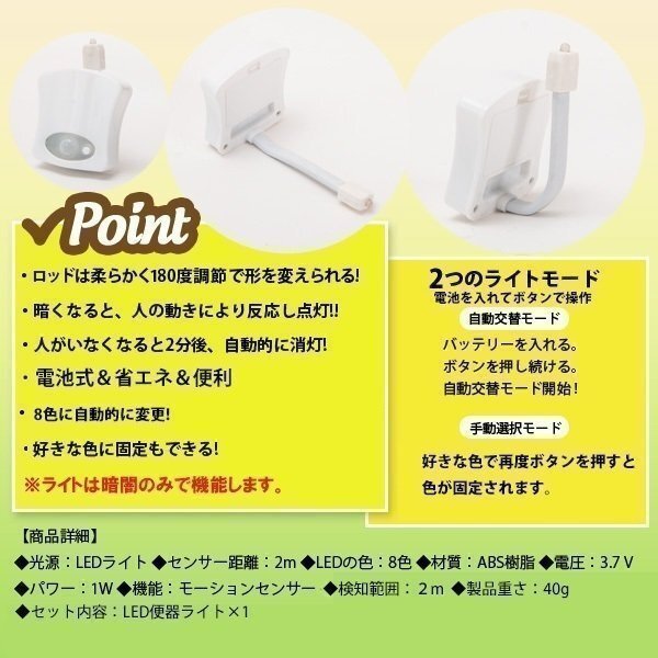 トイレ 人感センサー ライト 便座 LED ランプ 8色変換 省エネ お洒落 便器 玄関 お手洗い 8色LED 防水 ウォシュレット インテリア