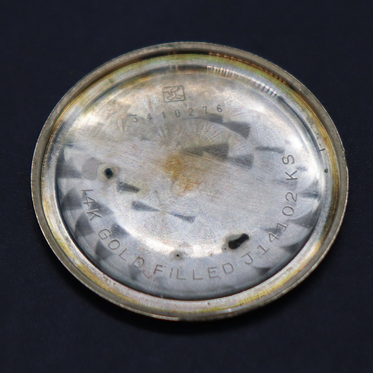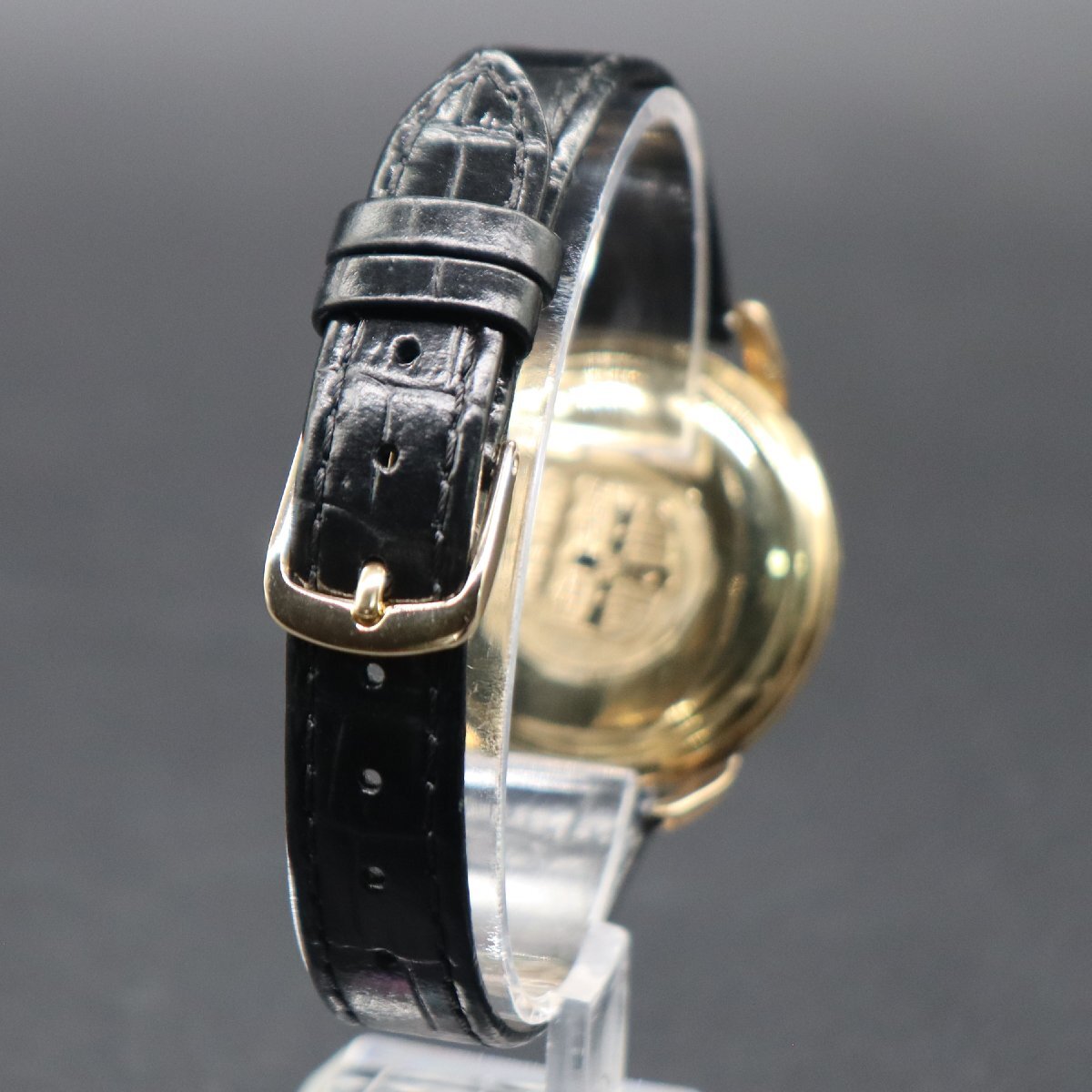 平置きで12時間動作確認済み、大幅な遅れなく稼働中です。 リューズ巻き止まりOK、一段引きで時刻調整可能です。 ※アンティーク時計を長くお使いいただくため、 丁寧に、やさしく操作していただくようお願いいたします。 全体に経年のキズ、小打痕、金特有の小汚れなど ございますが、風防は内側に微細な埃の付着が見受けられますが、 わずかな小キズ程度で、視認性は問題なく、比較的きれいです。 文字盤に目視では分らない程度の微細なチリ、 針に小汚れござますが、金無垢のインデックスは比較的傷み少なく、 プリントロゴや印字は消えなく、経年の割りには、 状態の良い、きれいなお品物かと思います。 リューズ、純正非純正か不明ですが、巻き上げ軽快です。 裏蓋に小傷みございますが、盾メダリオン付きです。 裏蓋内側に、純正ケースの証である鶴マークございます。 ベルトは、新品の国内メーカー製革ベルトに交換済みです。 古いお品物ですので、状態について、詳しくは画像にてご判断願います。 | |