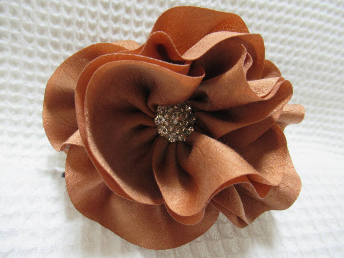 クリスタルのビジューの花型?付きオレンジ系色生地の花型付き バンスクリップ