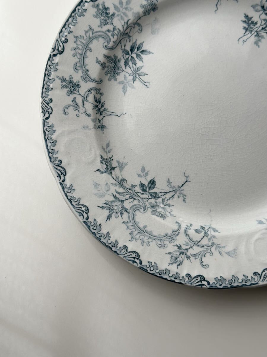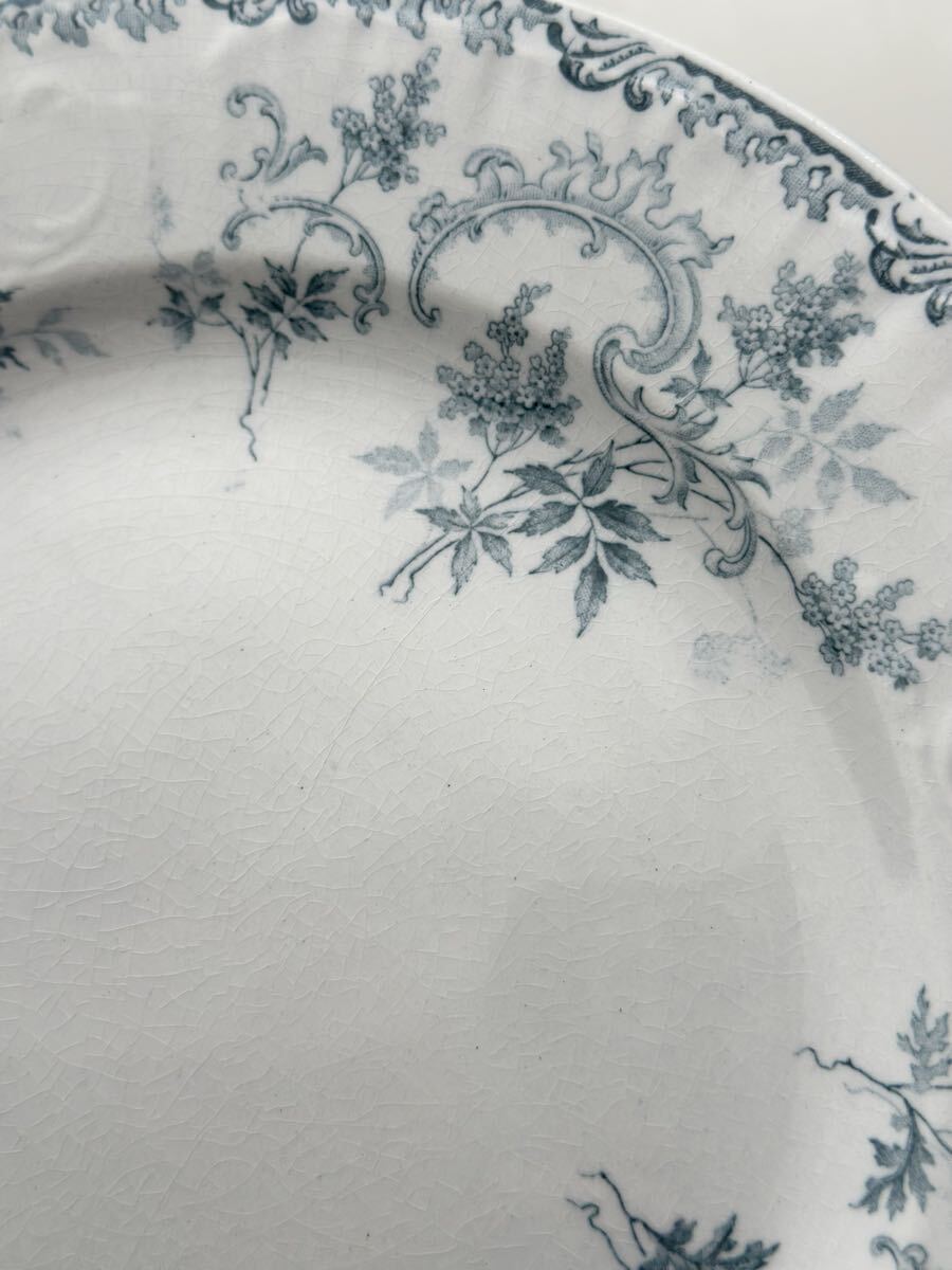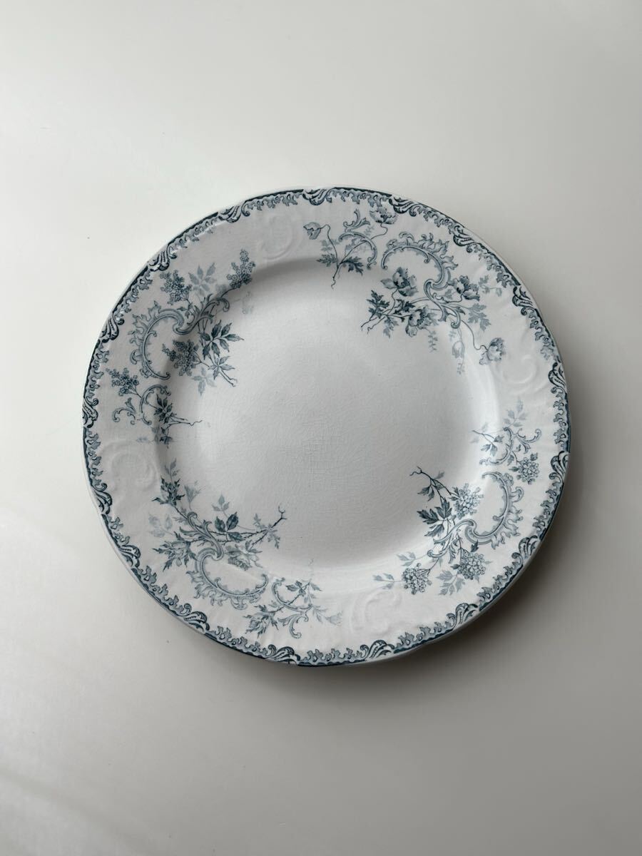 白釉に繊細なブルーグレーの植物文様が広がり、リムにはエンボス装飾が施された上品な1枚です。