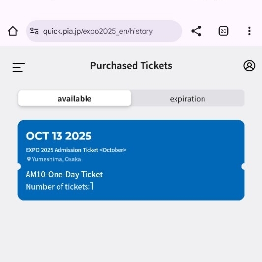 EXPO QUICK チケット 10/13(月) 西ゲート 朝10時~入場1日券、大人1枚 英語版