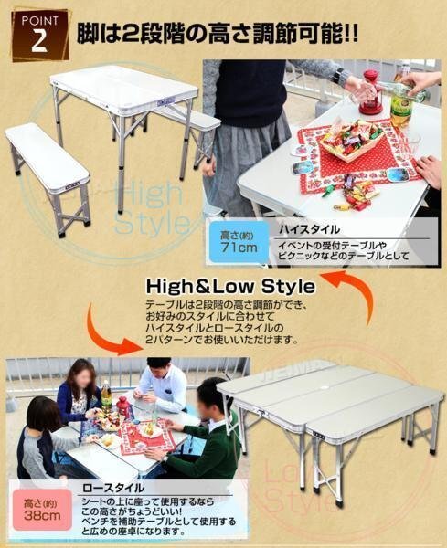 | 軽量アルミ製+取っ手付きで気軽に持ちだして、アウトドアやBBQにぴったりのテーブル&ベンチセットです。テーブルは2段階の高さ調節ができ、ローテーブルとしても使うことが可能です。キャンプ、バーベキュー、お花見などにとても便利!天板中心部にはパラソル用ホールがあるので、ベランダやテラスでの使用にもおススメです♪ |