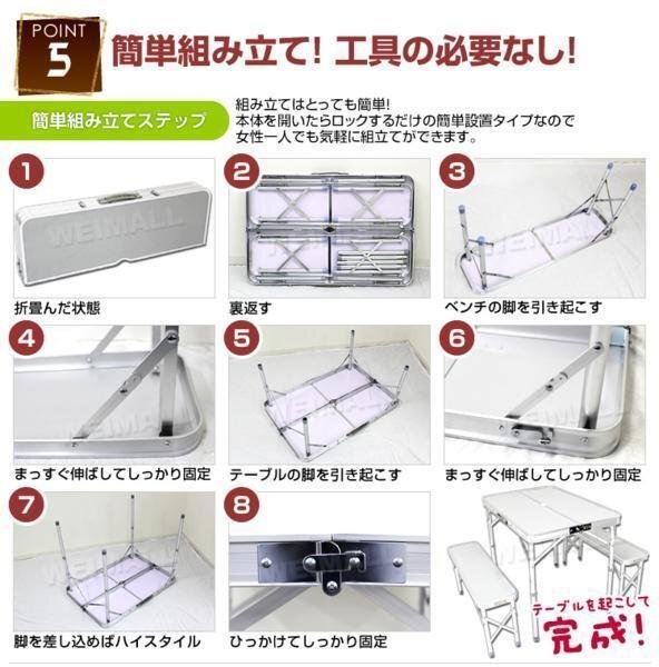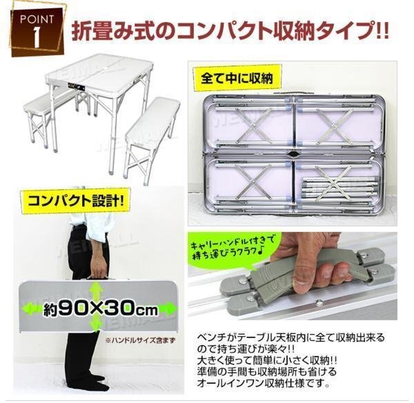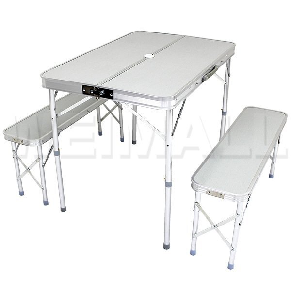 軽量アルミ製+取っ手付きで気軽に持ちだして、アウトドアやBBQにぴったりのテーブル&ベンチセットです。
