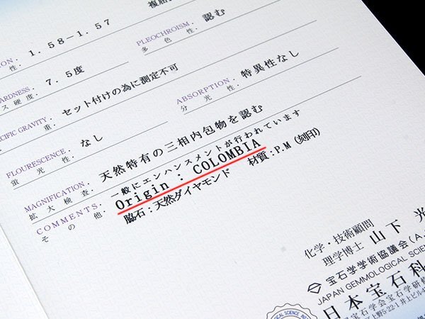 日本宝石科学協会発行の宝石鑑別書付属(産地記載有り)