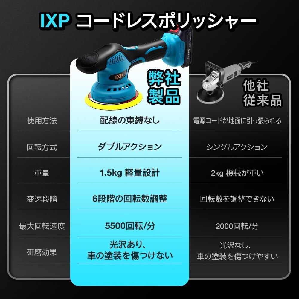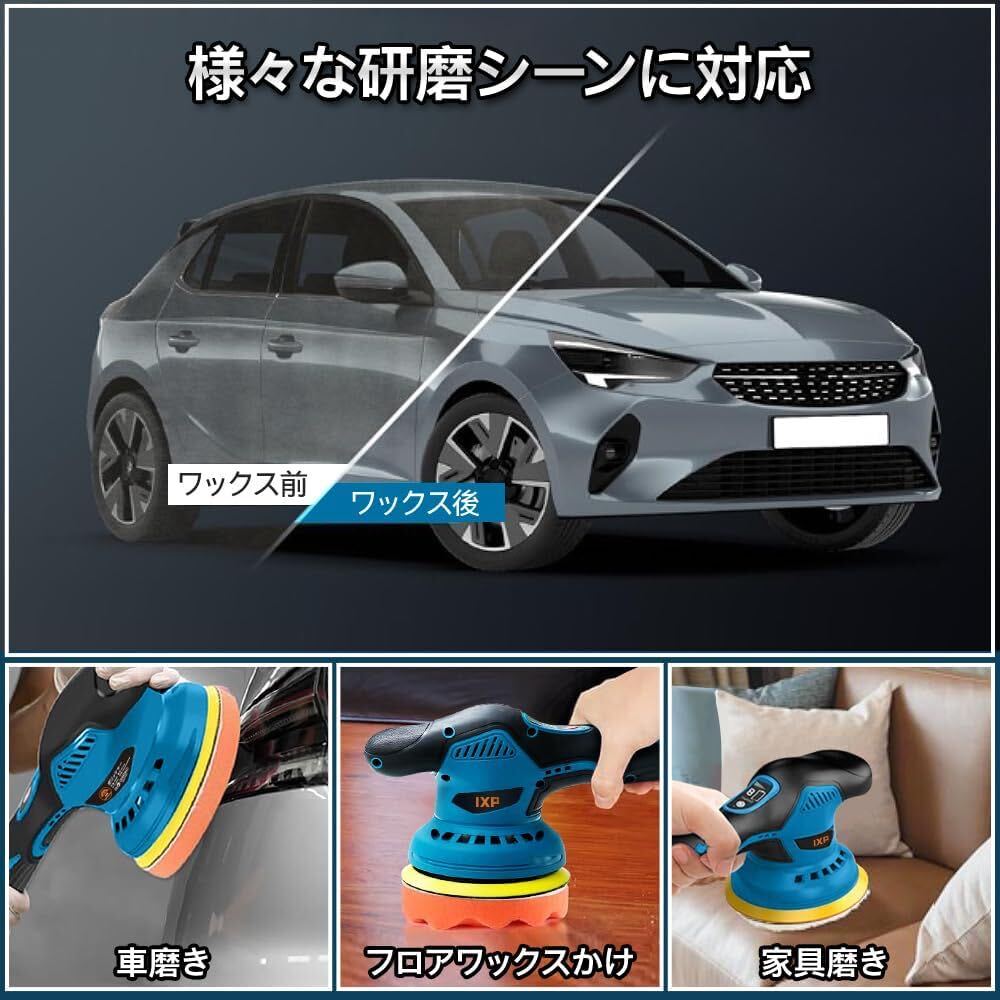 【コードレスで軽量★豊富な付属品★幅広い用途】IXPダブルアクションポリッシャーは、コードレス軽量で強力なパワーを備えた小型充電式研磨機です。電源コードを接続することなく使用できます。バッテリーを含めて重さはわずか1.5 kgで、腕が疲れにくく、初心者だけでなく、女性や高齢者の方にも最適です。カーポリッシャーには豊富なアクセサリが付属しており、さまざまなシーンや異なる素材の表面のケア、磨き、研磨を可能にし、追加のアクセサリー購入の必要がなく、1台のポリッシャーで多様なニーズを満たすことができます。ダブルアクションポリッシャーなので、シングルアクションに比べ傷やムラになりにくく高性能です。自動車のワックスや磨きだけでなく、家具の研磨、風呂場の掃除、大理石の磨き、物の元の光沢を復元し、金属製品の錆取りなど幅広い用途が可能です。