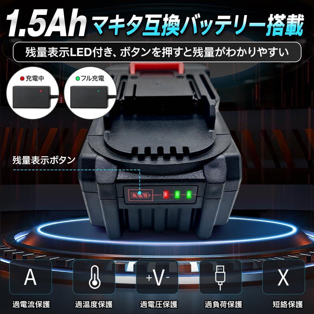 【マキタ互換バッテリー付き★LED残量表示】IXPコードレス式ポリッシャーには21V/18Vの1.5Ahマキタ互換バッテリーが付属し、挿入してすぐに使用可能です。また、マキタ18V純正バッテリーと互換が可能です。バッテリーの残量表示ボタンを押したら、3段階の残量表示ライトが点灯します。バッテリーはどのくらい容量があるか一見だけで分かって安心します。通常2時間でフル充電でき、フル充電すれば30分以上使用できます。また、充電状態表示LEDが搭載されています。充電中はLEDが赤色に点灯し、充電が完了するとLEDが緑色に点灯します。注意:新しいバッテリーは満充電されていない場合があります。使用時間を確保するためには、手に入れた後まずバッテリーを充電してください!