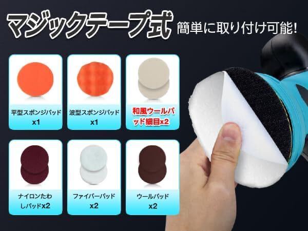 【6段階変速可能★9mm偏心構造】IXP電動ポリッシャーには和式研磨バフが装備されており、日本車により適しています。PSE認証済みの製品ですので、安心してご使用ください。充電式ポリッシャーは従来の2段階変速製品に比べる6段階の変速にアップグレードされ、研磨シーンに応じて細かく変速できます。ポリッシャーの操作も簡単でスイッチを長押しすれば起動し、一回押すごとに速度が1段階上がります。作業内容に合わせて回転数は2800rpmから5500rpmの範囲で調整可能です。ポリッシャーは新しい偏心構造の回転方式を採用し、9mmの不規則な偏心軌道を使用することでより省力化、より広いポリッシング面積と強力なポリッシング力を提供します。傷のあるペイント面をカバーし、作業効率を大幅に向上させ、作業時間を短縮します。また、過熱の心配がないように、複数の放熱口も設計されています。(変速段階:1-2段階はワックスを軽く塗る。3-4段階は均一にワックスを塗る。5-6段階はワックスをしっかりと磨き込む)
