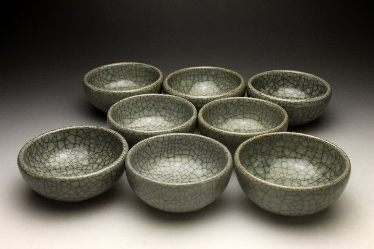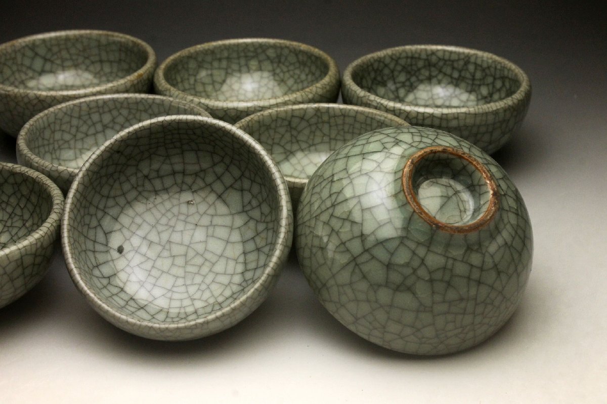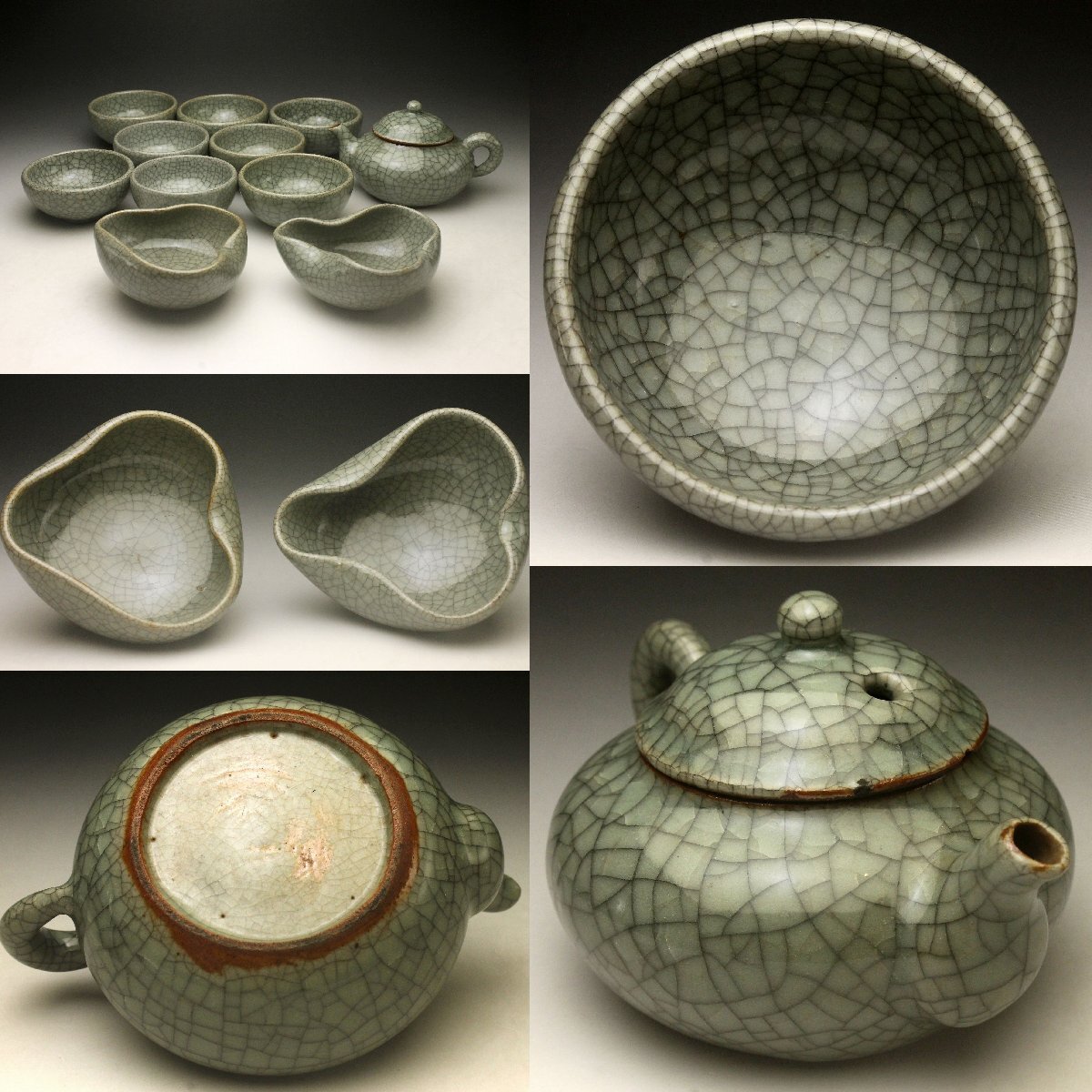 【余韻】 中国美術 貫入 青磁 煎茶器11点セット★急須 湯呑8客 湯冷2点 時代物<同梱可>